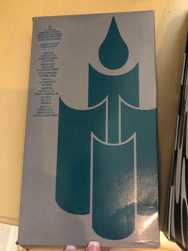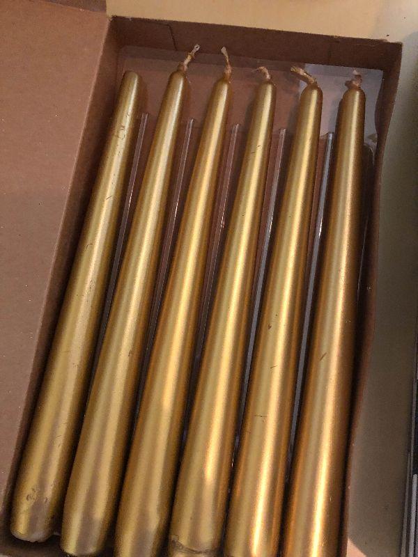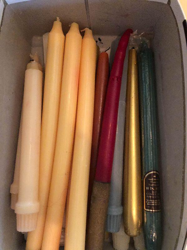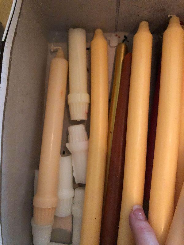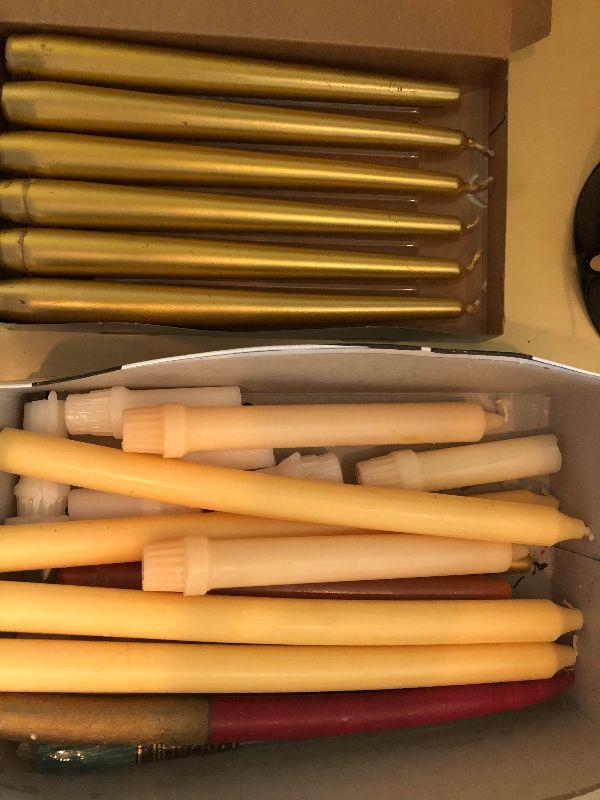 Collection of mostly new taper candles in gold, yellow, and cream. A mixture of Party Lite and Colonial Candles of Cape Cod.