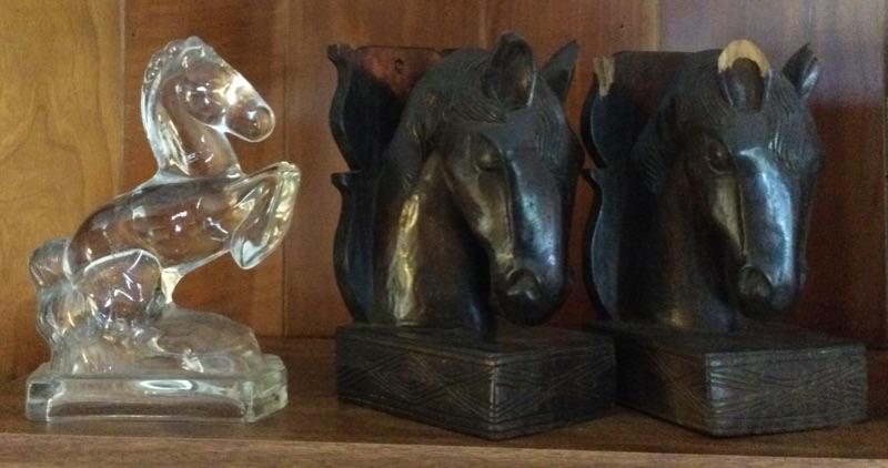 Vintage Incolay stone horse box, pair of wood horse head bookends, some damage (see photos) and a glass horse figure