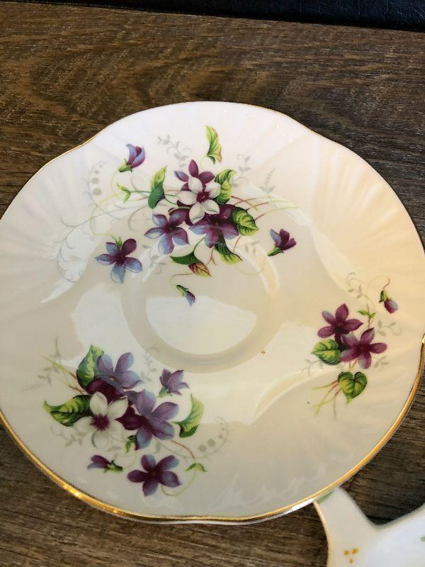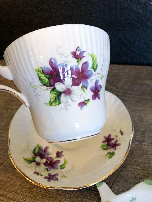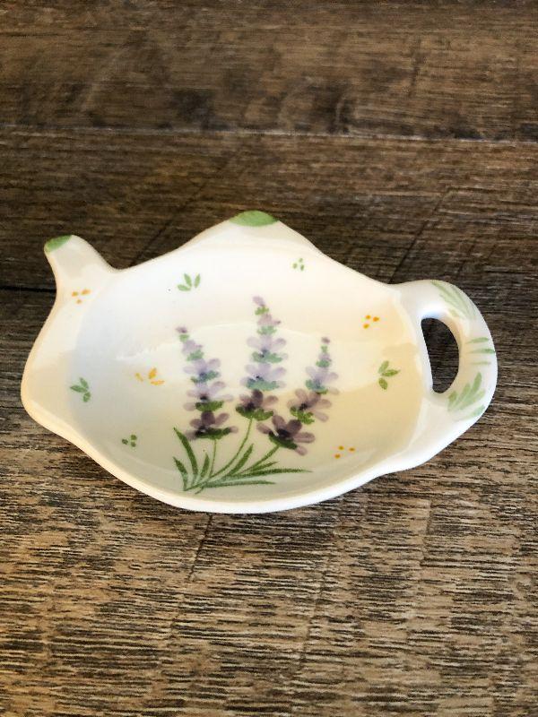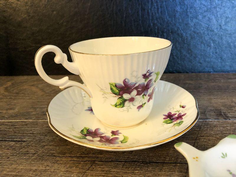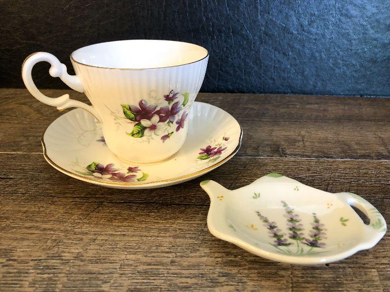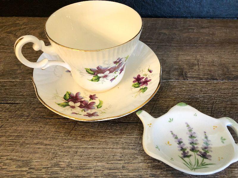 Tea cup, saucer and tea bag holder. Please refer to photos for size and condition. Have fun and happy bidding.