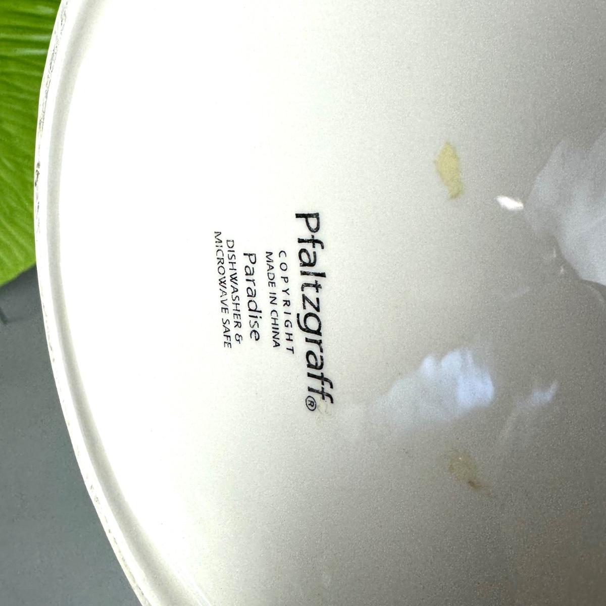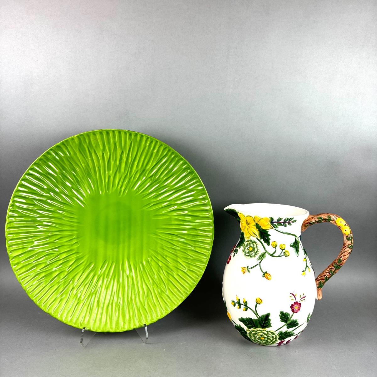 The platter is Ceramiche Virginia in green and measures 18" diameter. the pitcher is Pfaltzgraff "Paradise" is 12" x 10"diameter.
