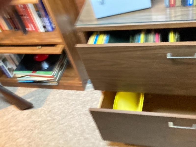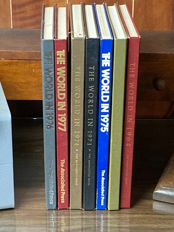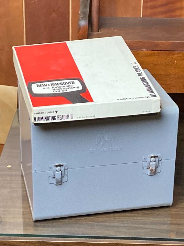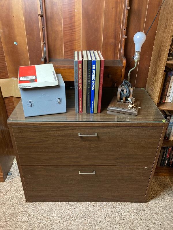 Two drawer file cabinet, metal box, The World Books 1964, 1971,1973, 1974, 1975, 1976, 1977, Nautical Lamp and Illuminating Reader II