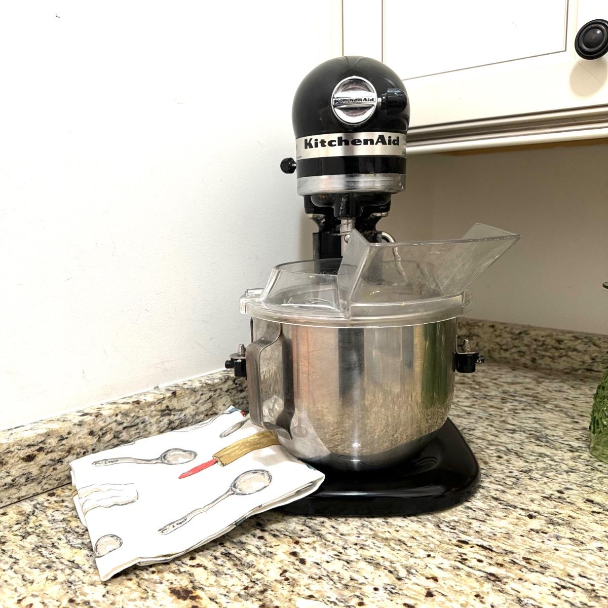 The mixer is black, heavy duty, K5SS, 5 qt size.