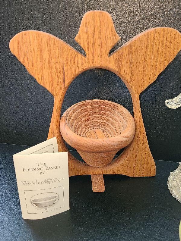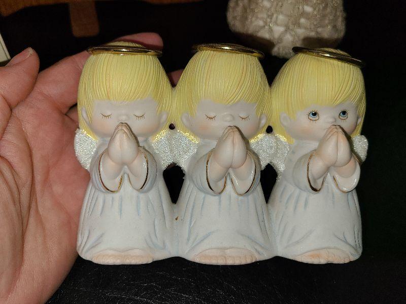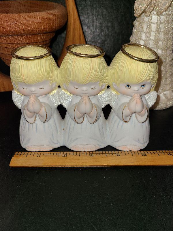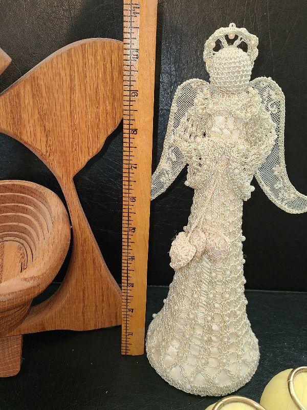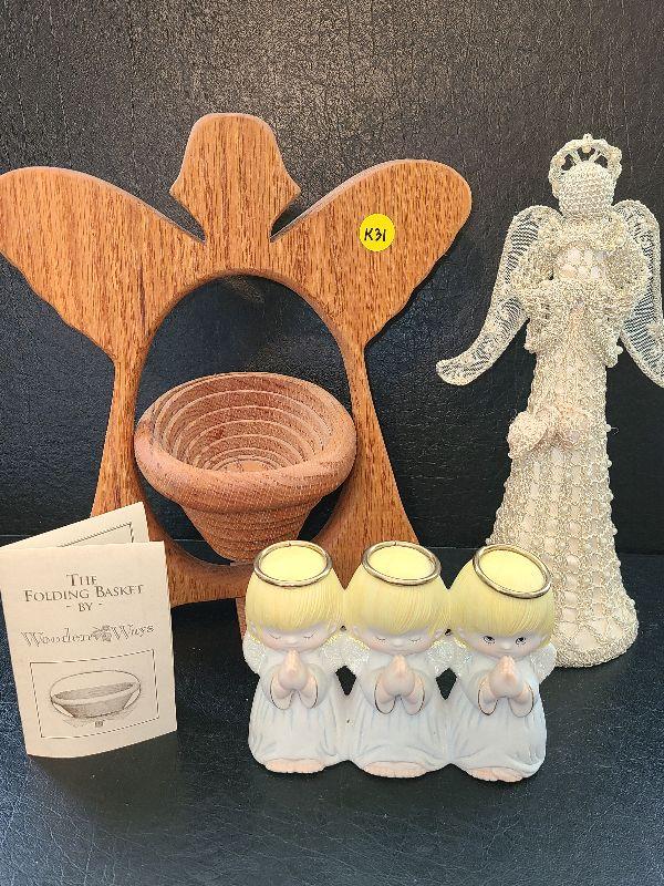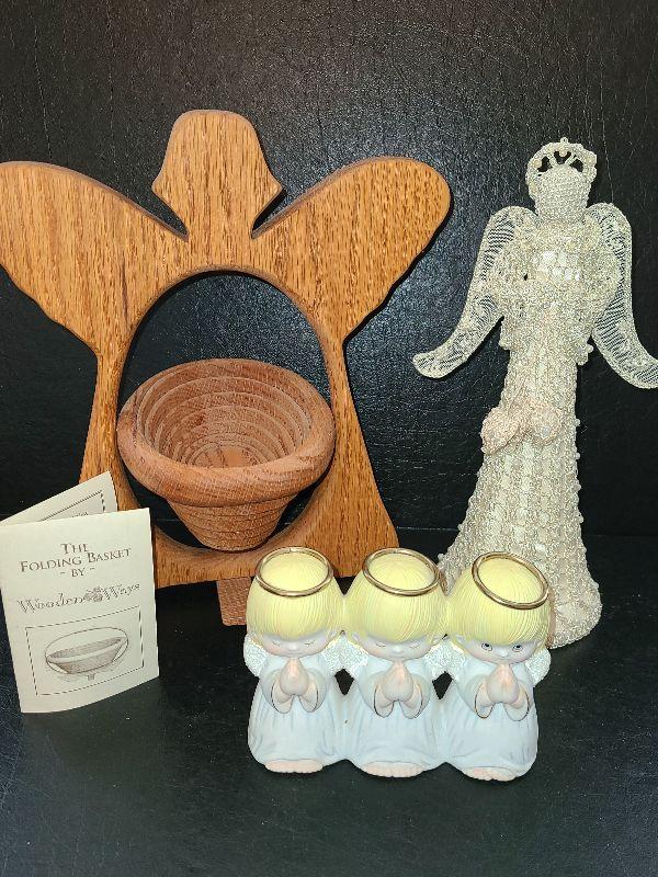 The angel folding basket is perfect because it folds for storage or to use as hot plate. The praying angels are an older Hallmark Piece and the tall angel looks to be handmade. Perfect to add to your decor or collection. Please see all pictures for exact contents of the lot, condition of the items, and if measurements if taken. Thank you for looking and have fun bidding.