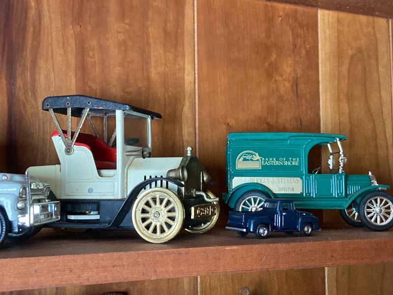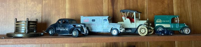 Three Bank Of The Eastern Shore vintage car banks, set of five coasters and model car music box