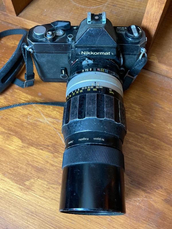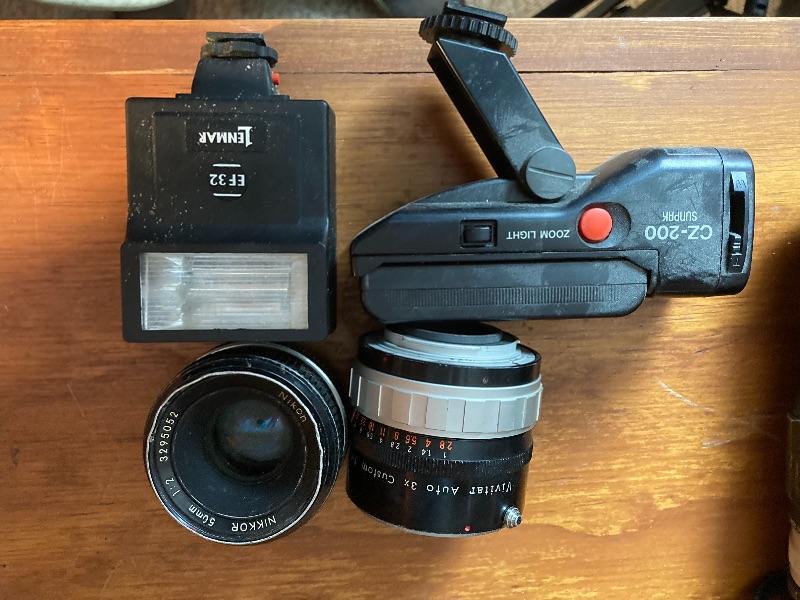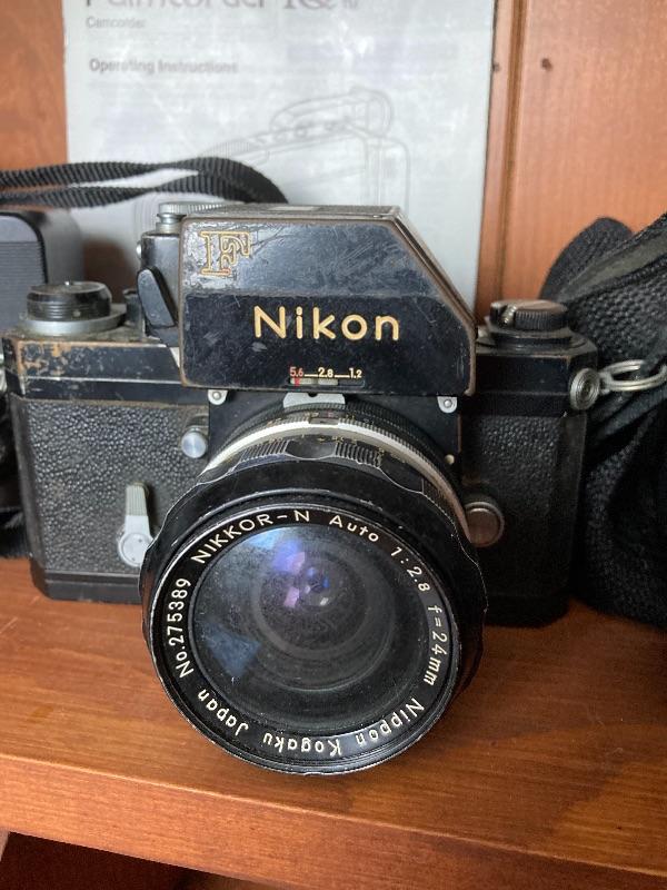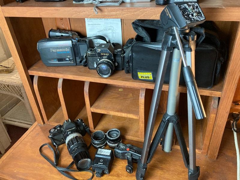 Panasonic palm corder iq video camera, Nikon Nikkormat 35mm camera, two flashes, two lenses and tripod
