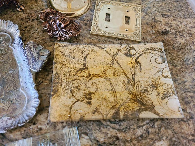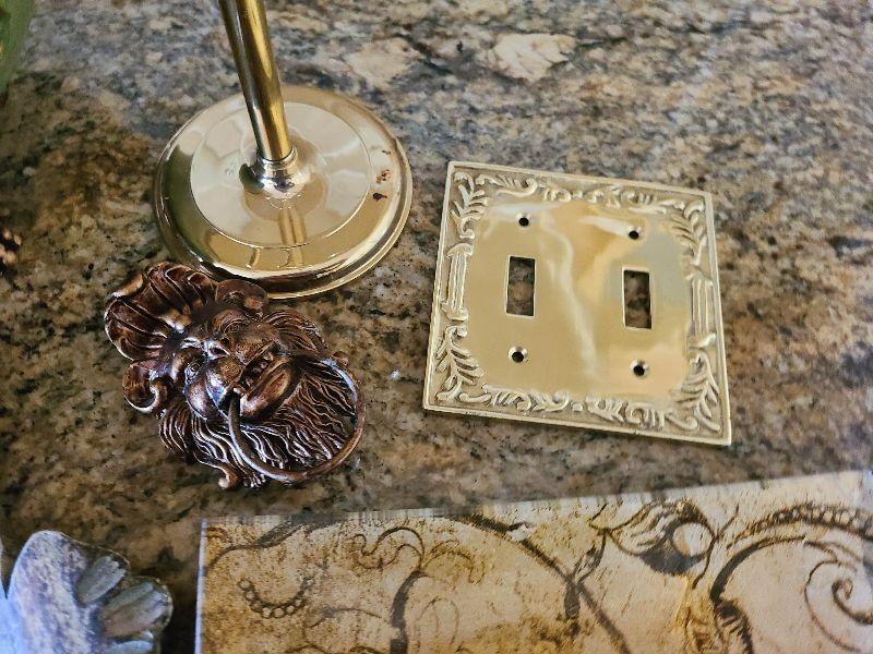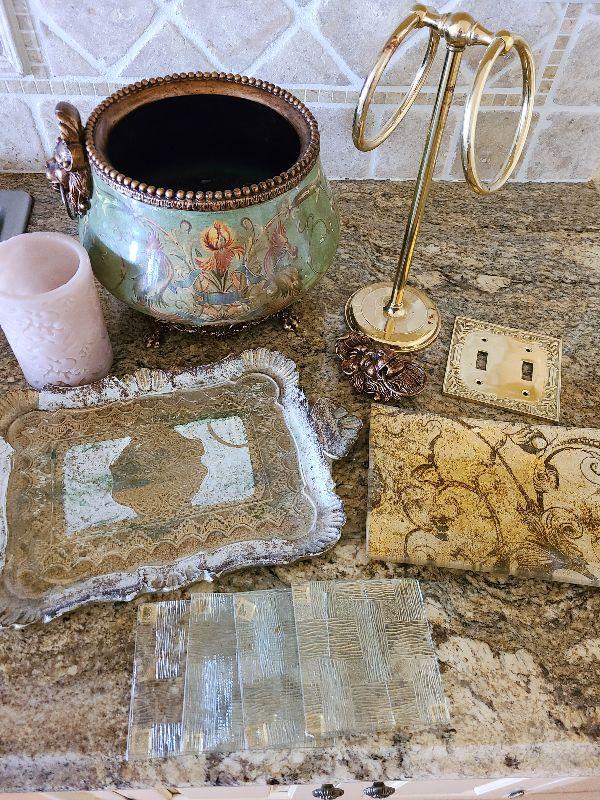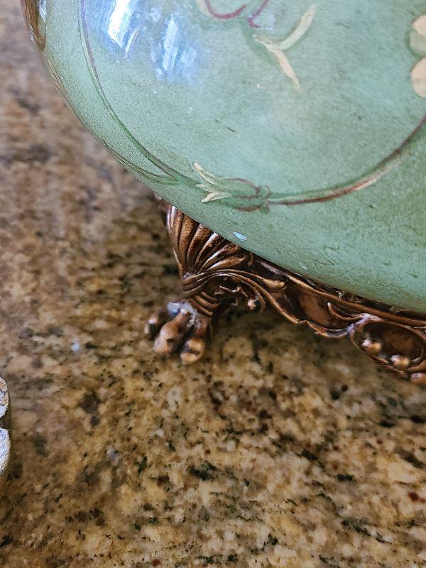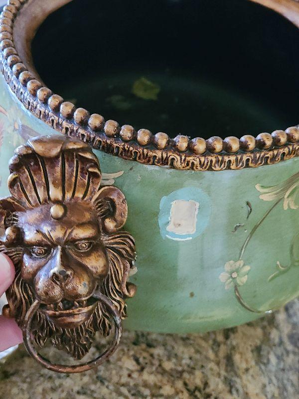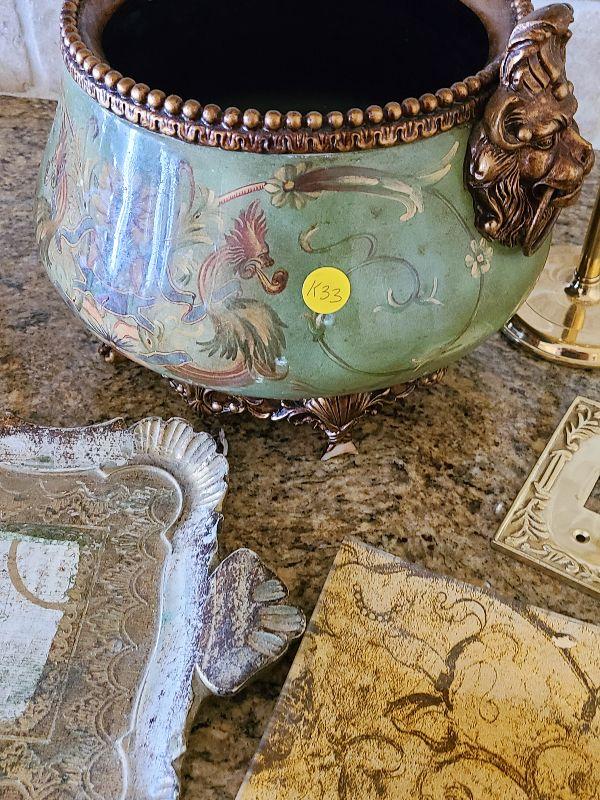 Large Decorative Pot has one lion and foot that needs to be repared. Easy fix. Please see pictures for content/condition of the lot. Good luck and happy bidding.