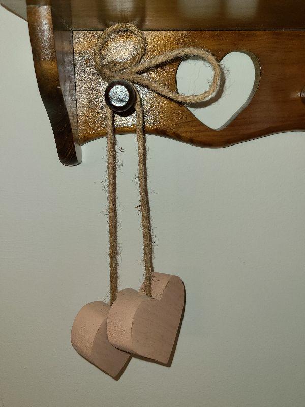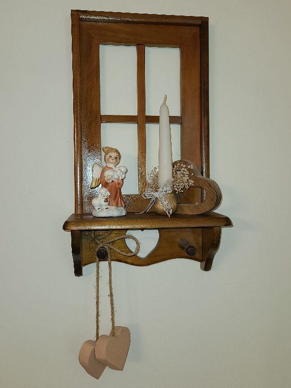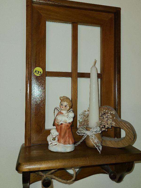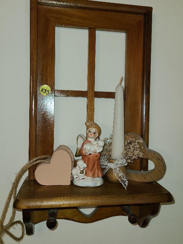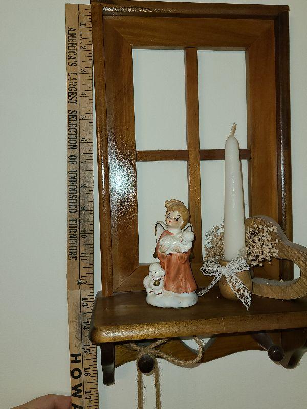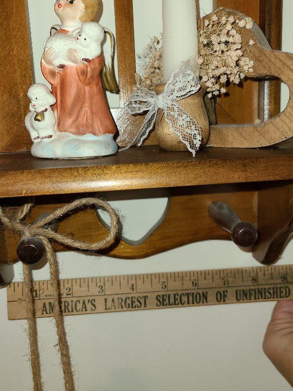 This shelf has a ledge for displaying smalls and hooks for hanging. Would look great in any room and is perfect for Farmhouse Design. Please see all pictures for exact contents of the lot, condition of the items, and if measurements if taken. Thank you for looking and have fun bidding.