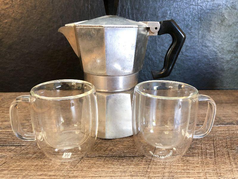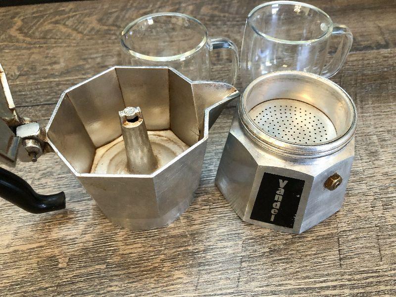 2 Zwilling JA Henckels glasses and vintage Vandel Coffee Espresso Pot Made in Italy. Please refer to photos for size and condition. Have fun and happy bidding.