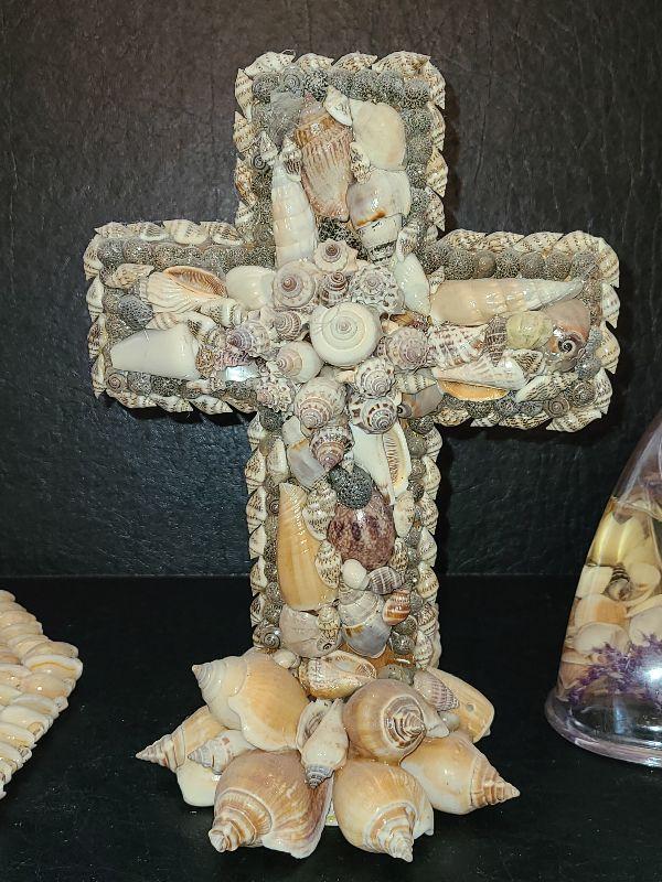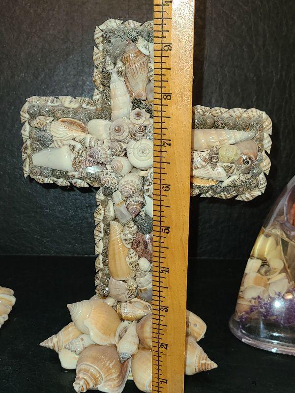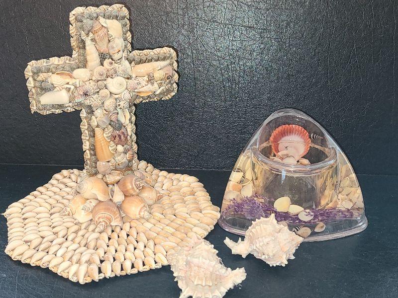 Nice lot of shell decor. The cross has a matching mat that could be used anywhere. Please see all pictures for exact contents of the lot, condition of the items, and if measurements if taken. Thank you for looking and have fun bidding.