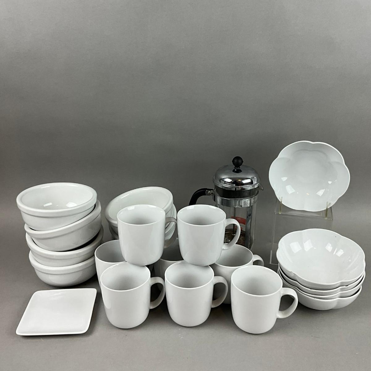 5 scalloped bowls (few chips), 7 round bowls, 8 William Sonoma mugs, french coffee press by Bodum