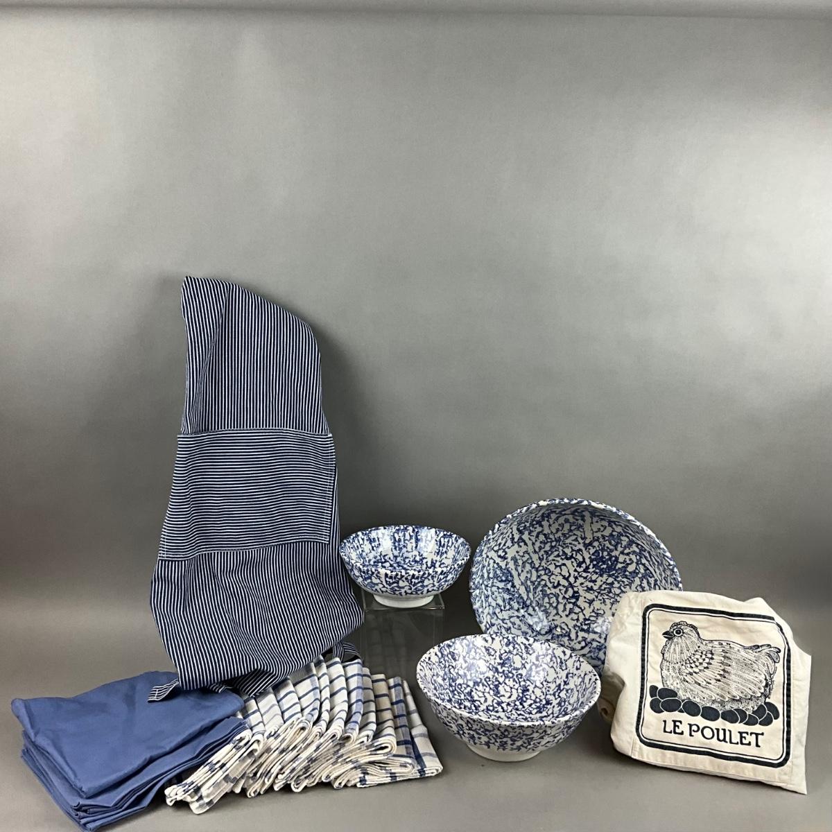 K385 Set Of Three Italian Spongeware Bowls With Aprond & Napkins