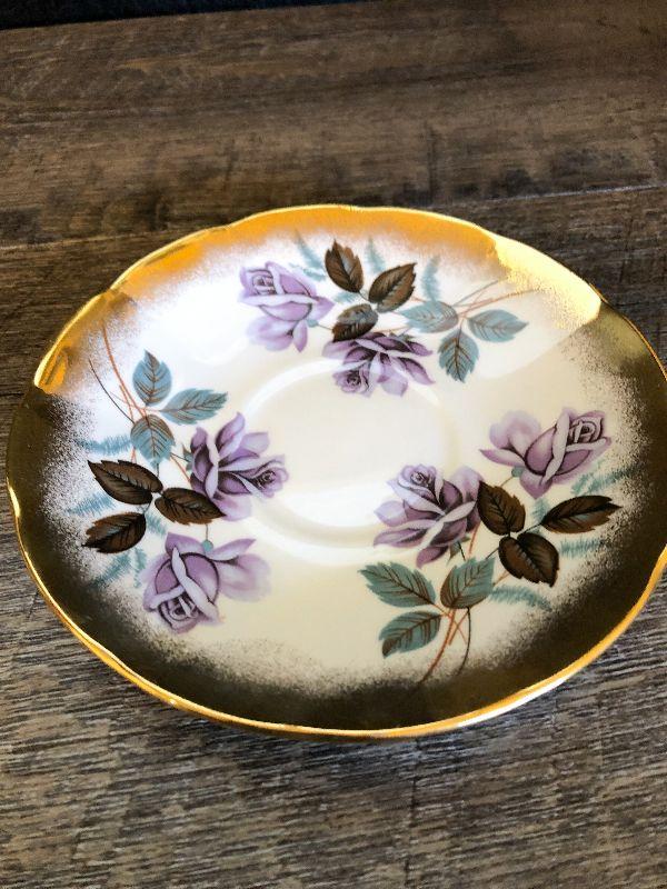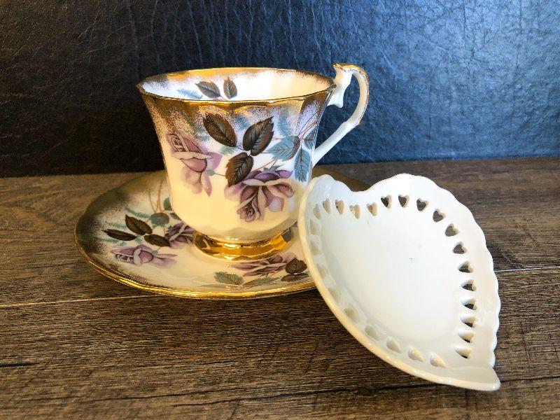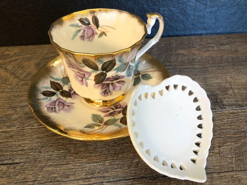 Tea cup, saucer and tea bag holder. Please refer to photos for size and condition. Have fun and happy bidding.