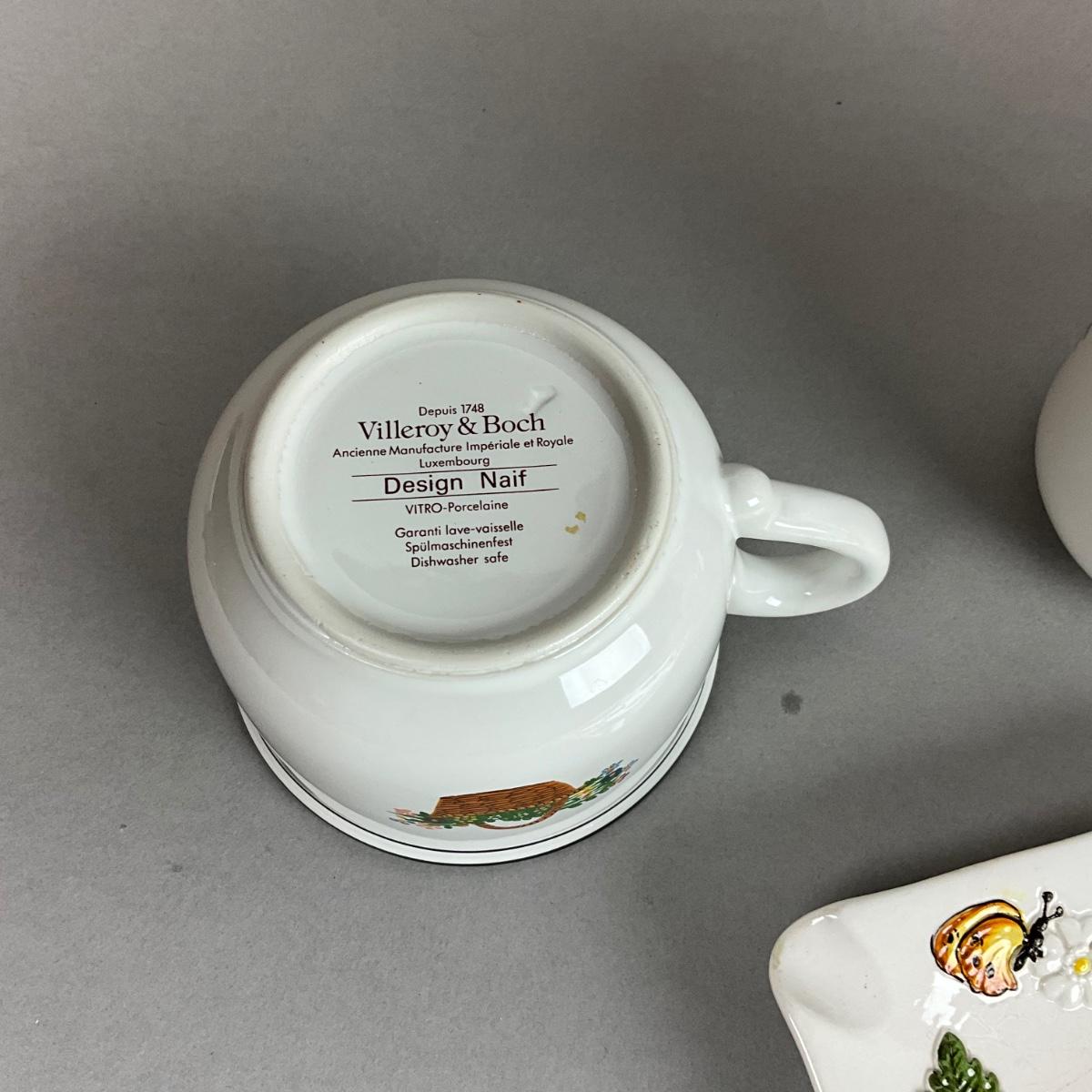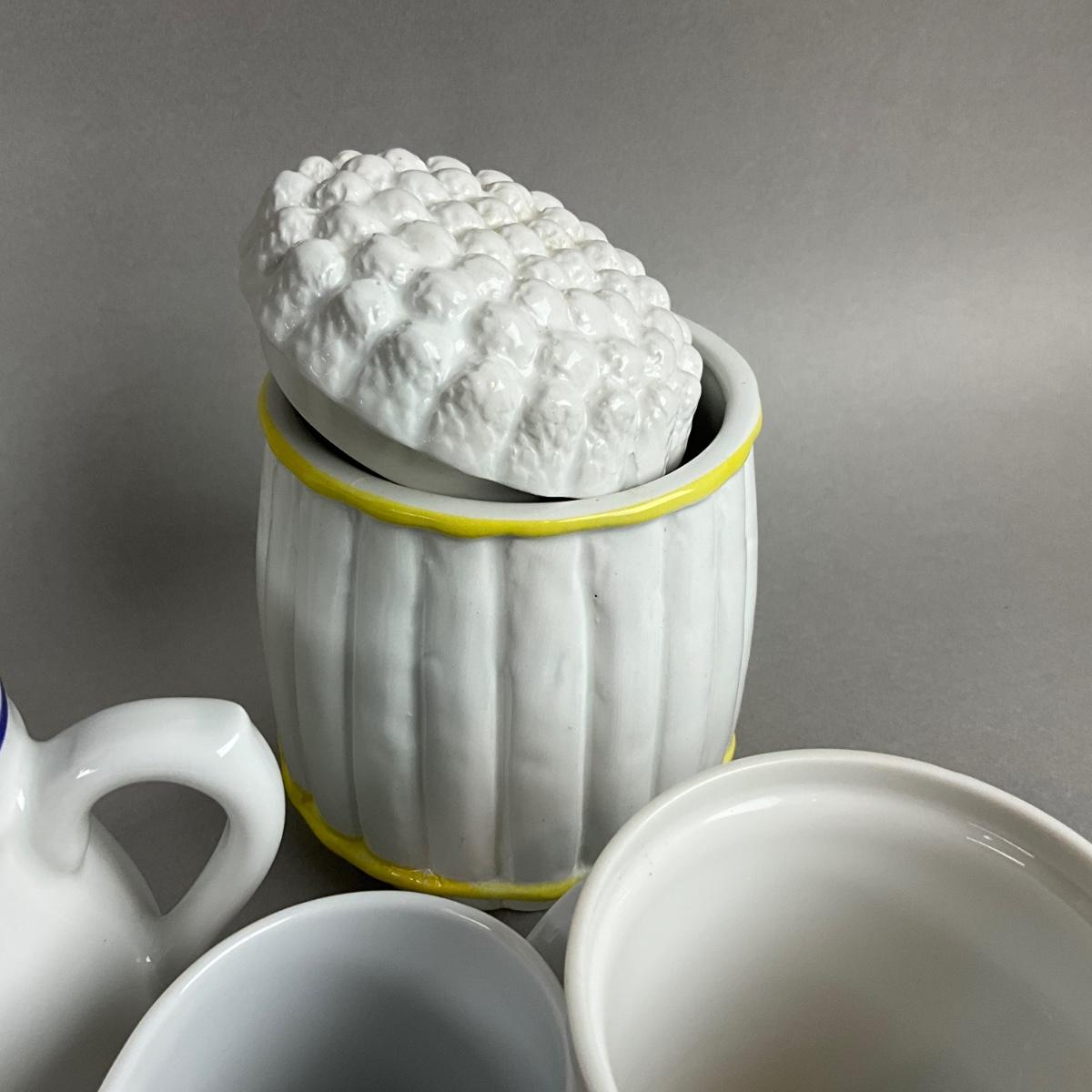 covered asparagus dish, french creamers, yogurt cups , villeroy and boch creamer , mug, and sugar, covered dish, lettuce salt and pepper