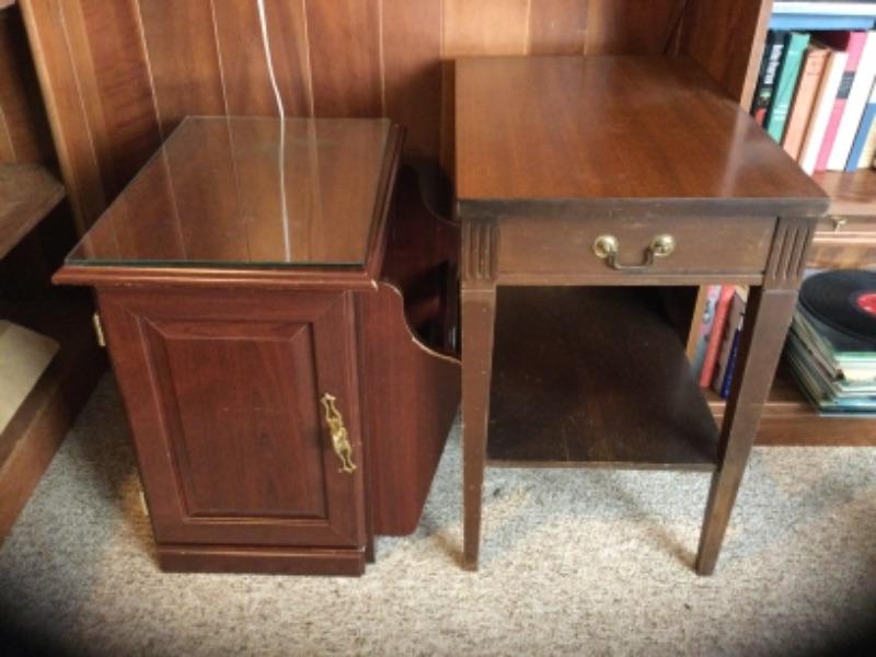 Morsman single drawer end table 23” high 16’ wide 23.5” deep. Sauder Woodworking side table with cabinet and magazine holder 20.5” Tall 18” wide and 21” deep
