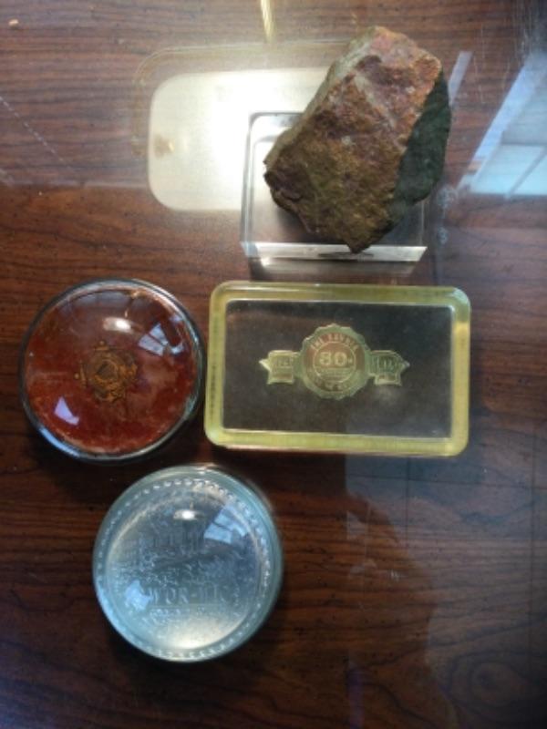 Brass students desk lamp with moveable globe for directing light at different angles and four paperweights - United States Coast Guard, Wor-Wic Community College, The Banner 80th Anniversary and Rock on an acrylic base