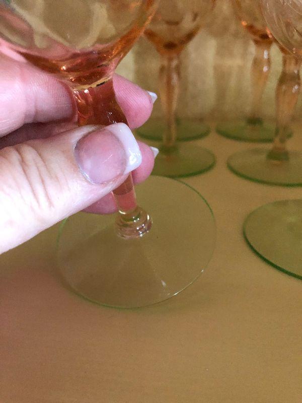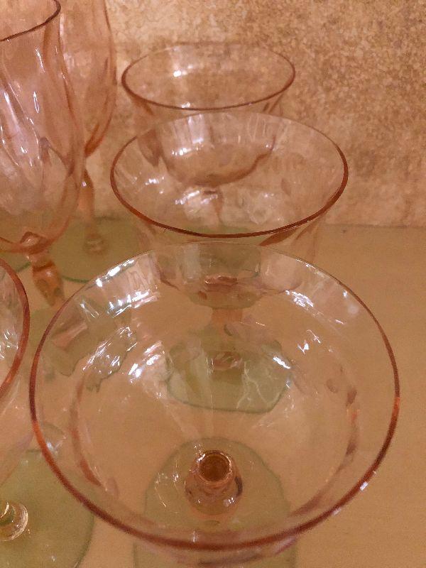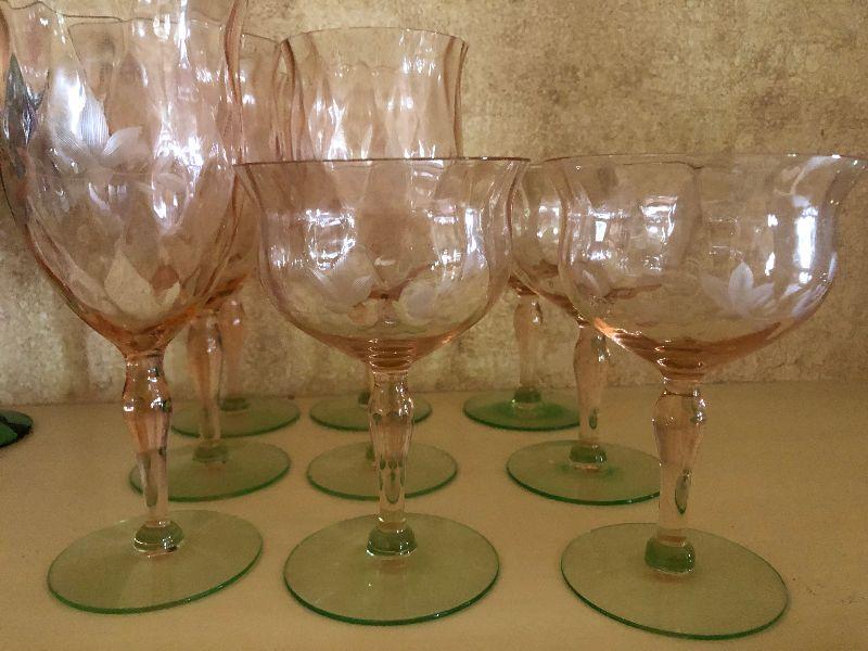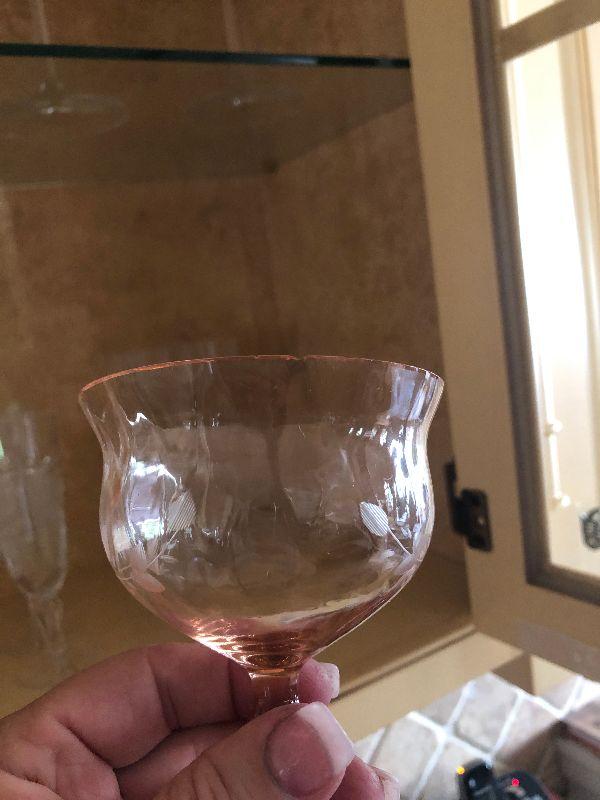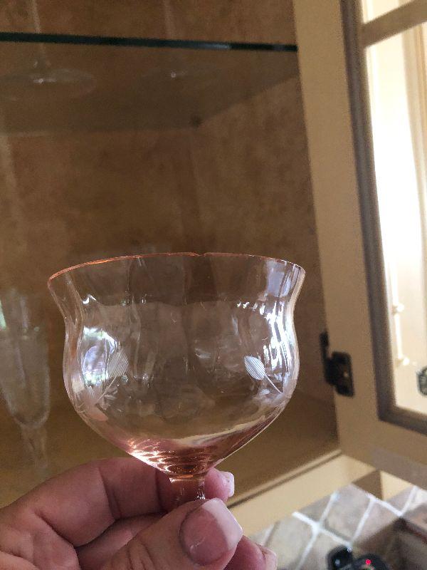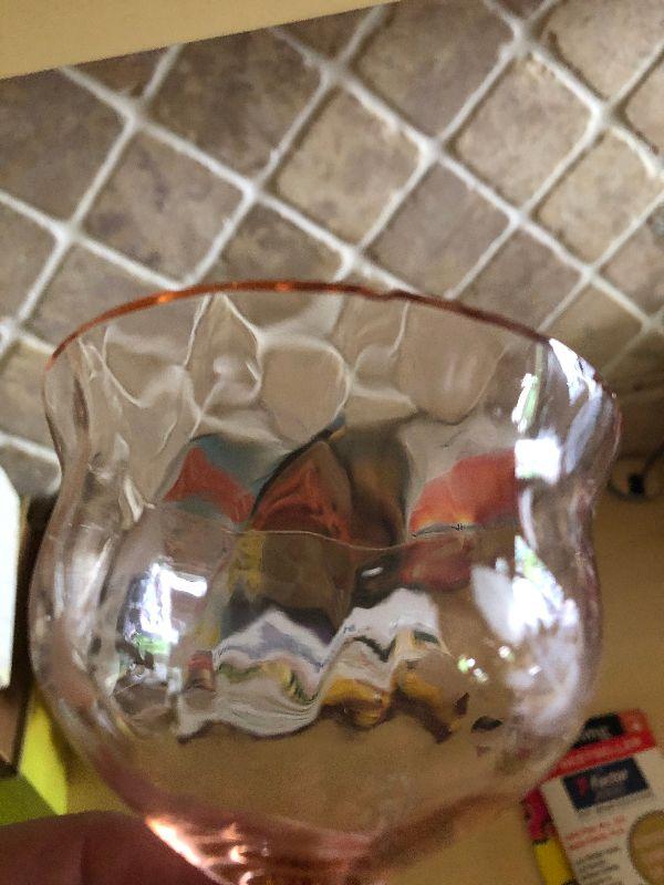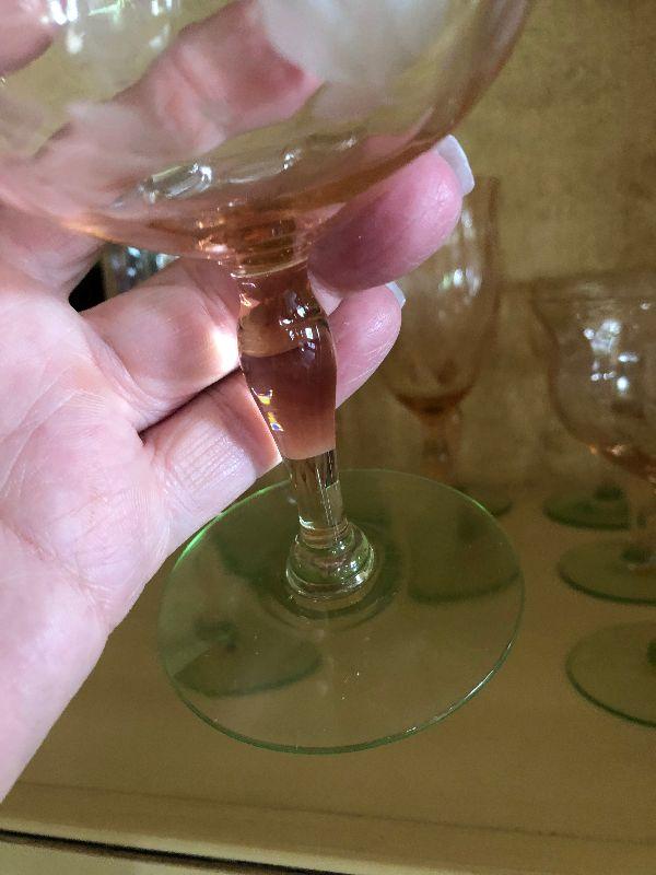 The base is a green glass while the stem and bowl are a beautiful light pink color. This type of glass is known as elegant depression glass. Which means that after the glass left the mold, embellishments such as polishing and etching were done. Glassware of this type is somewhat scarce since not that much of it was made. It was costly to produce and for buyers to purchase.Companies that made watermelon glass included Louie Glass Company, Weston Glass Company, and West Virginia Specialty Glass Co., all located in West Virginia, as well as Tiffin Glass, Standard Glass, Cambridge Glass and U.S. Glass, McDonald Glass Works of Pennsylvania, and Fry Glass Company of Rochester, Pennsylvania. All these companies employed highly qualified glass blowers to produce elegant glassware such as the etched watermelon glass. Watermelon glass is hard to find, with etched watermelon glass being even more scarce.Please bring packing material for transport.