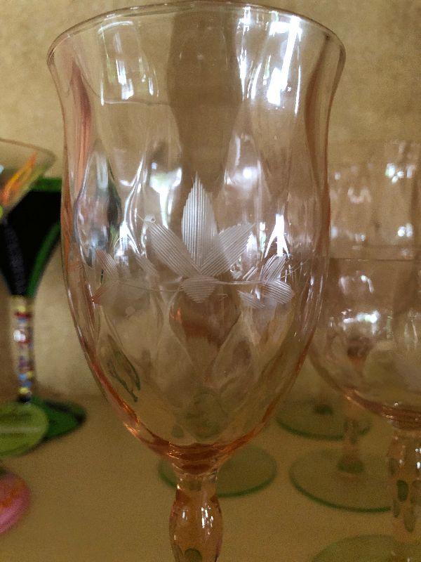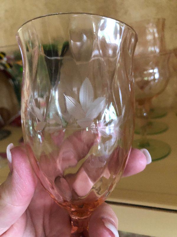 K44: Watermelon Pink and Green Depression Glass Floral Etched Wine Glass