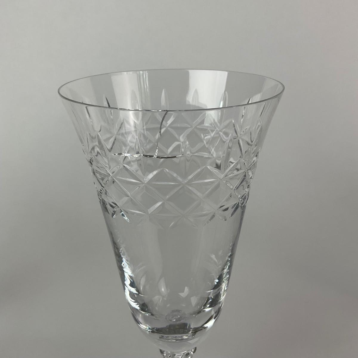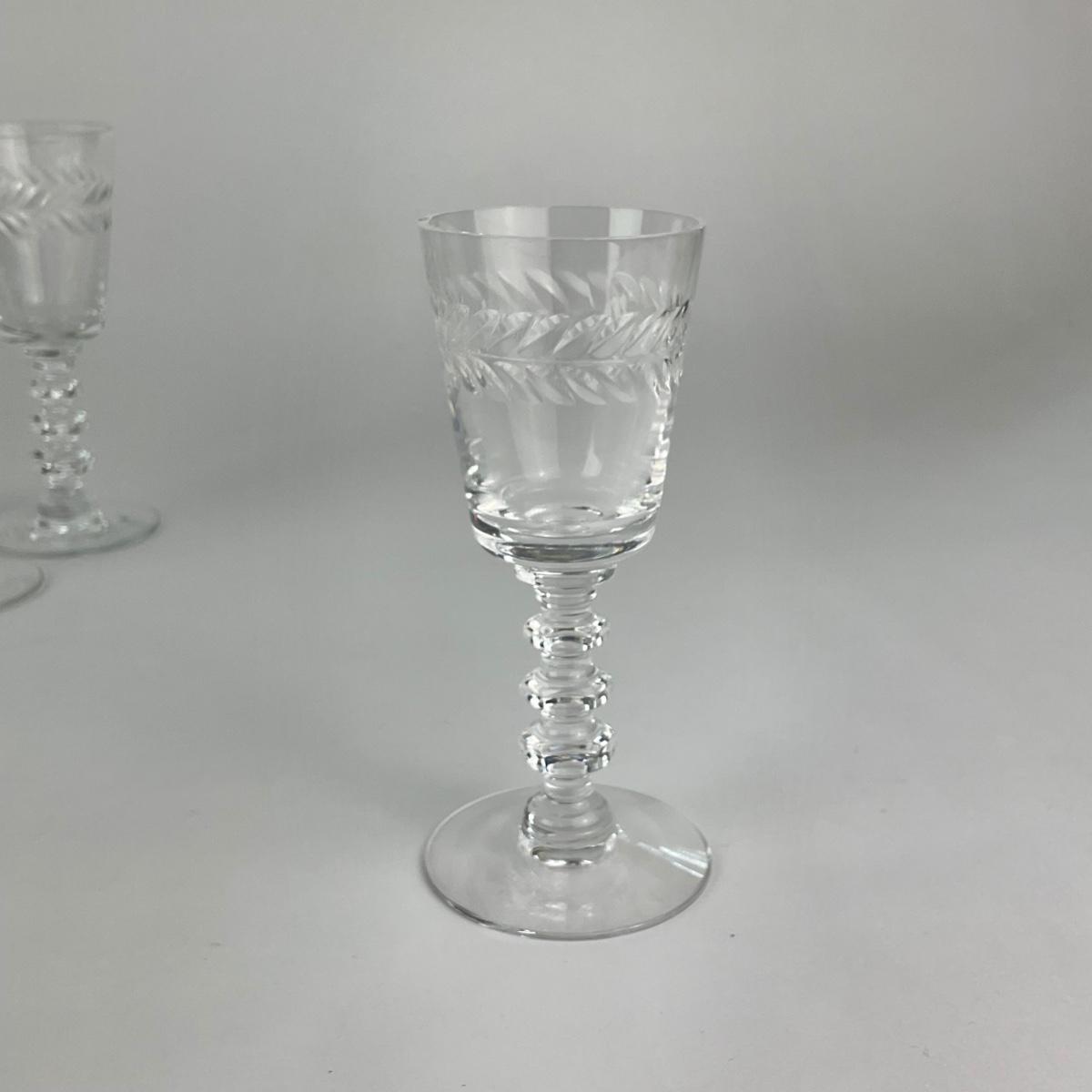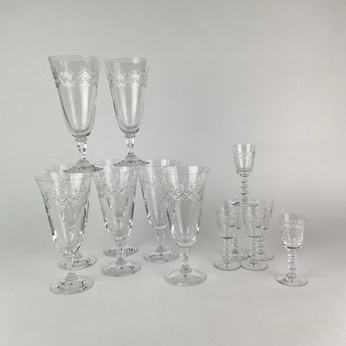 Includes 14 Glasses, 8 large stemware and 6 cordials. Has geometric etched patterns. One large glass has crack please refer to photos