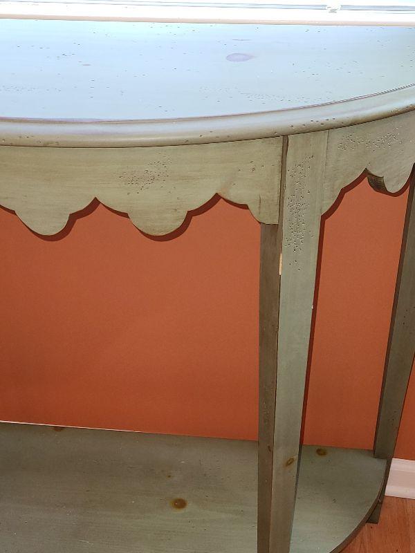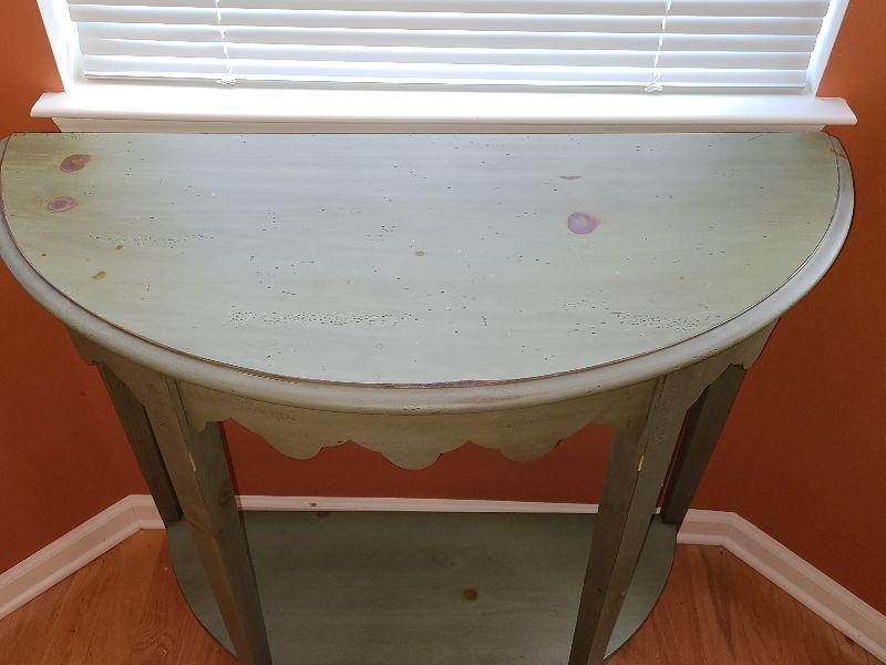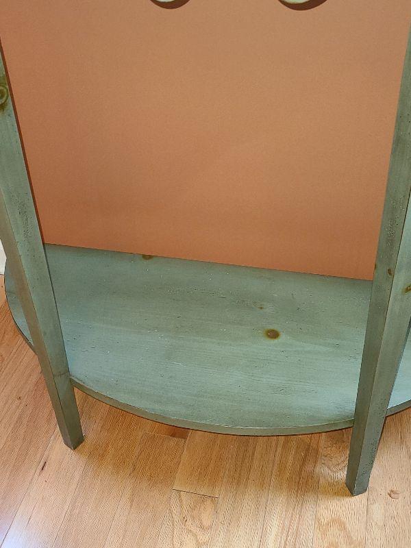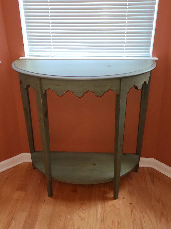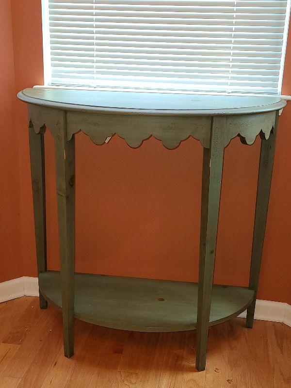 This is the perfect table for anywhere in the house, and fits perfectly under a window. Made of pine and painted a beautiful sage green color. It does show some distressed signs of design and wear. 38 x 16 x 36 inches. Please see pictures for contents of the lot, condition of the lot, and measurements if needed. Thank you for looking and have fun bidding!