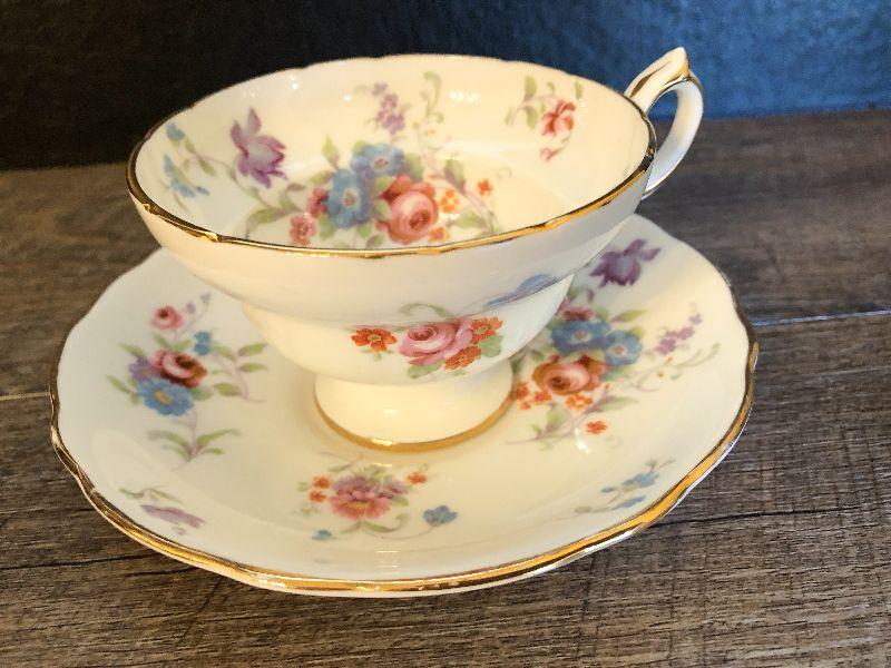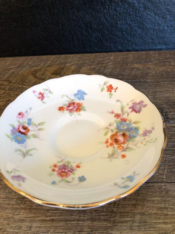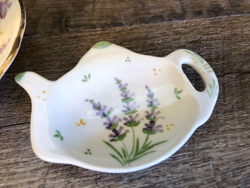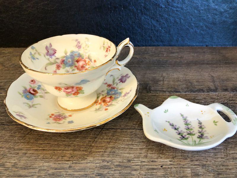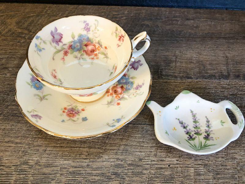 Tea cup, saucer and tea bag holder. Please refer to photos for size and condition. Have fun and happy bidding.