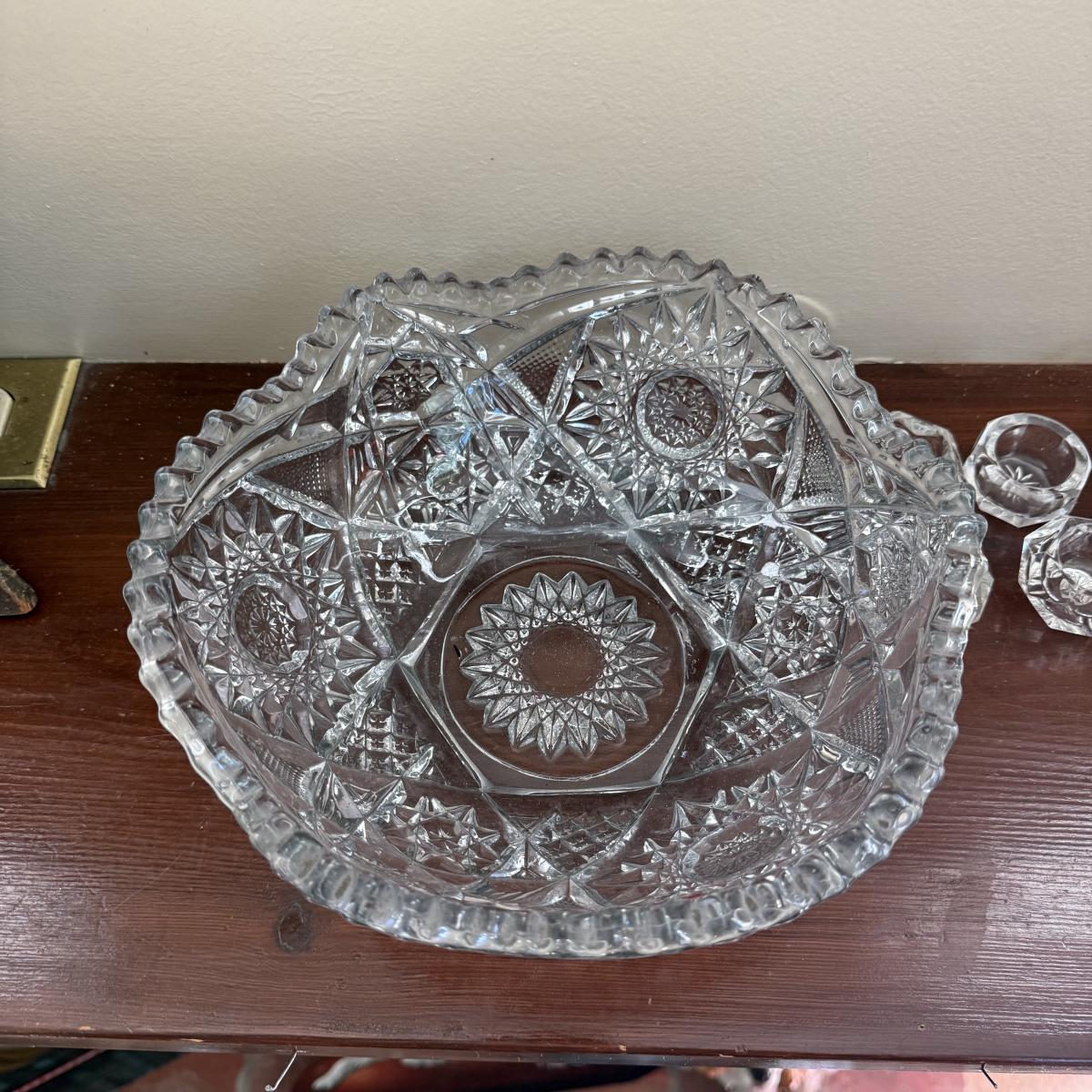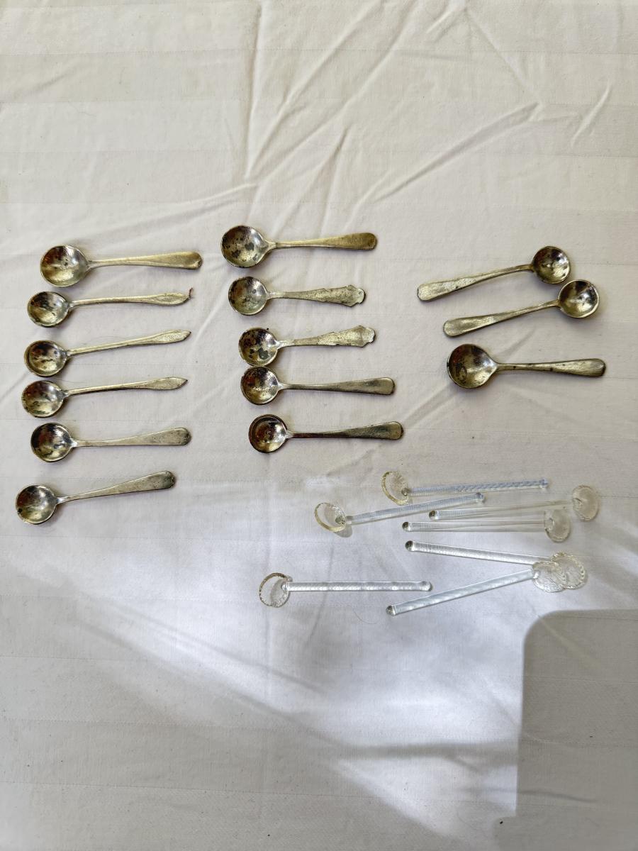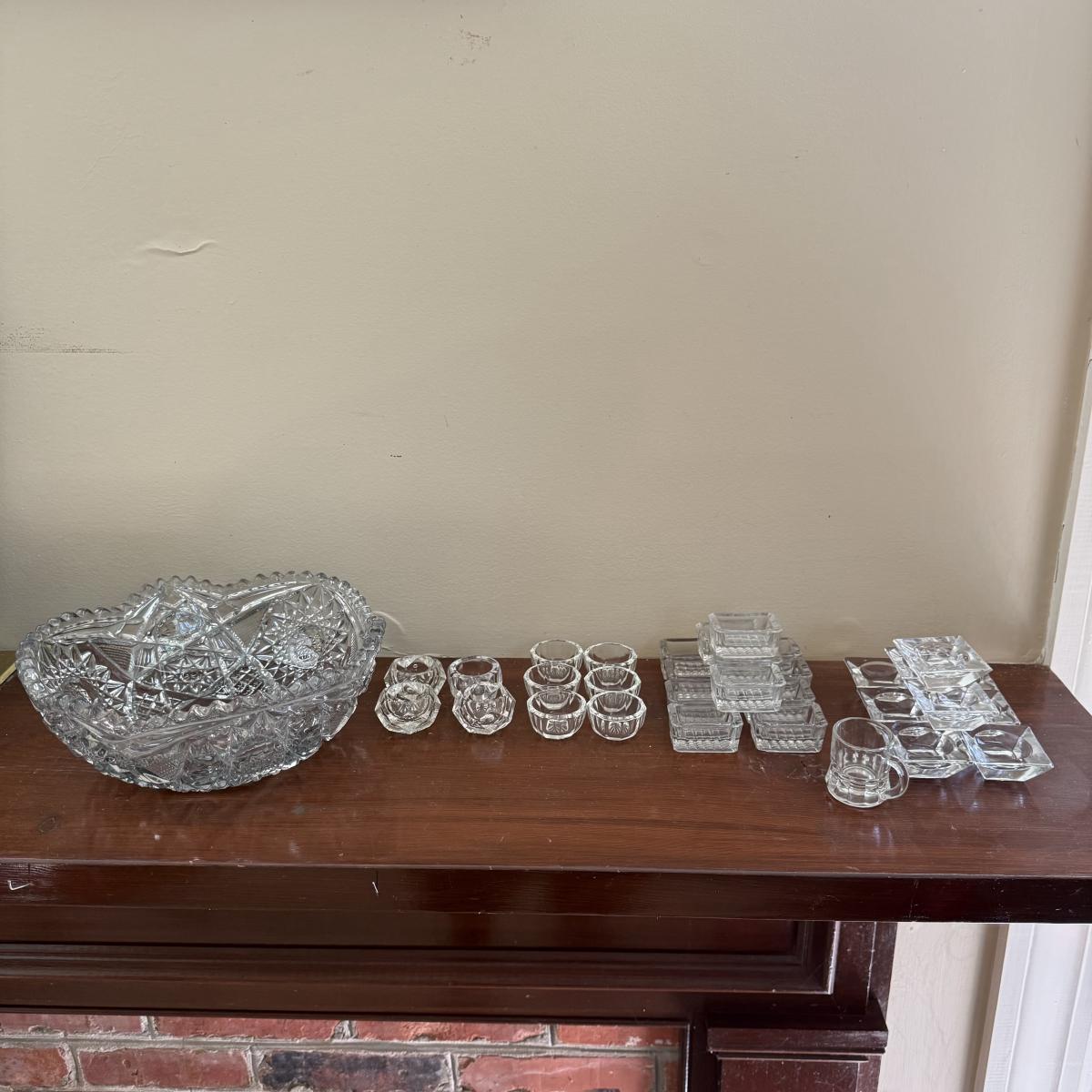 Comes with large cut glass bowl and several matching sets of salt bowls and salt spoons