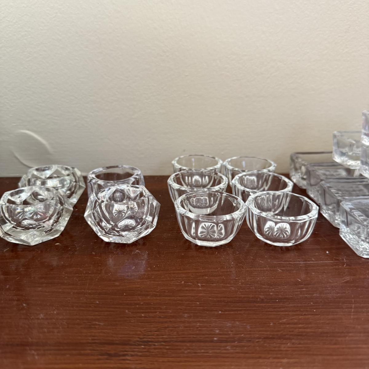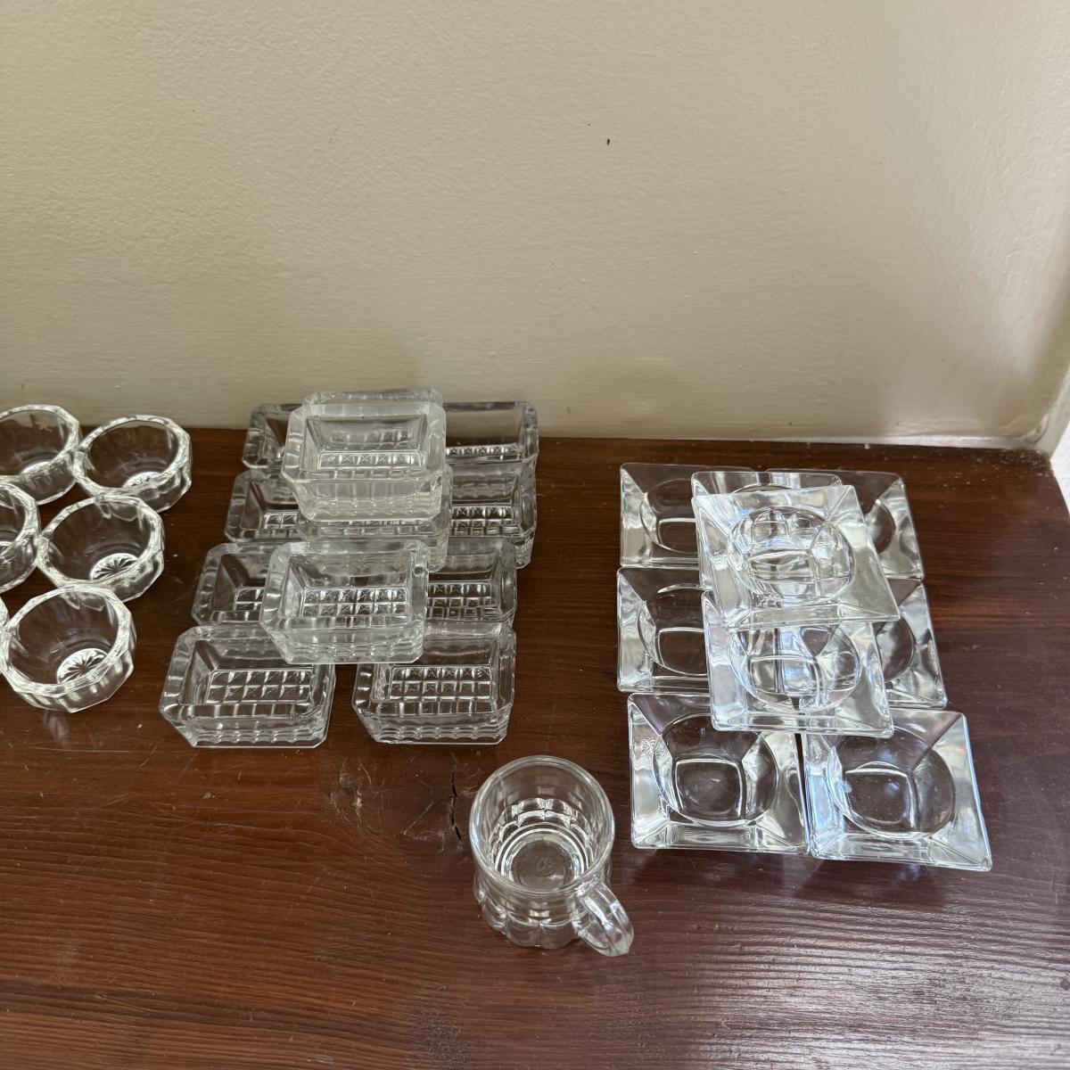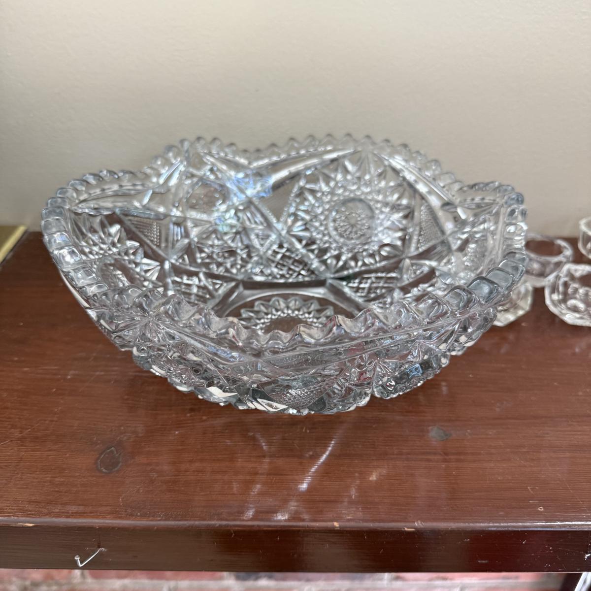 Comes with large cut glass bowl and several matching sets of salt bowls and salt spoons