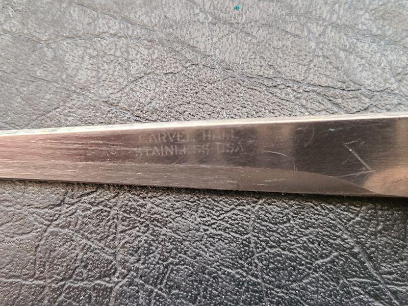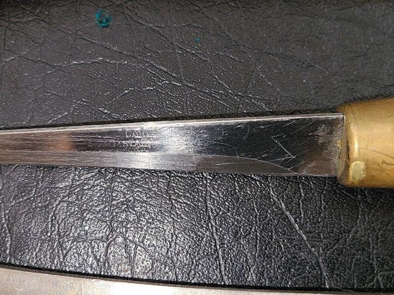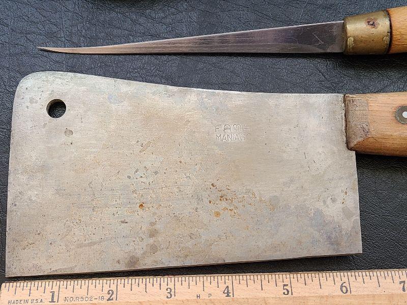 Vintage Heavy Duty Fama Maniago Butcher Knife, Cleaver and Carvel hall Filet Knife with sheath. Please see all pictures for exact contents of the lot, condition of the items, and if measurements if taken. Thank you for looking and have fun bidding.