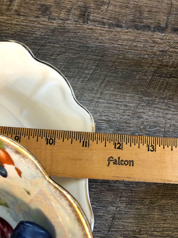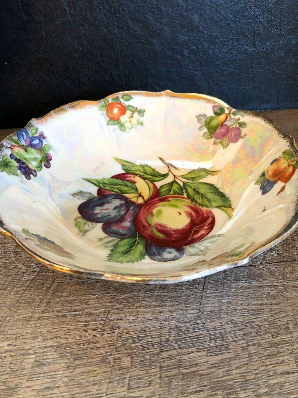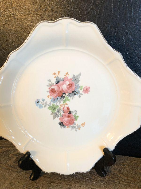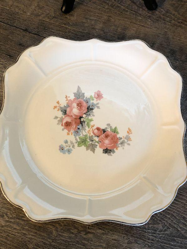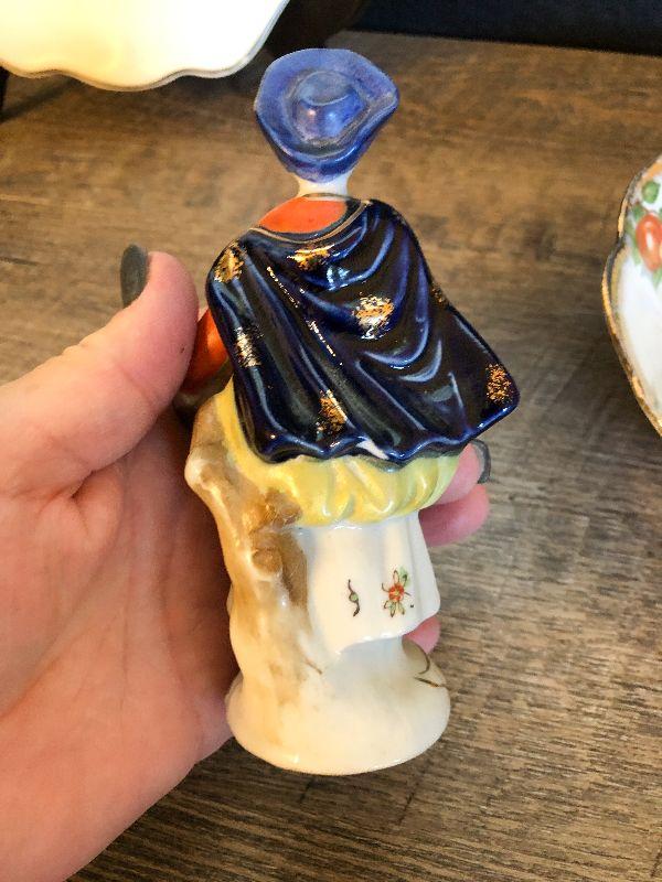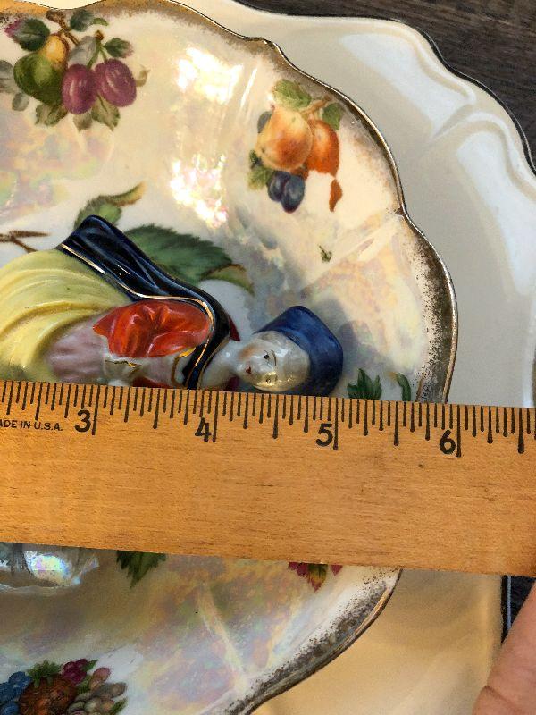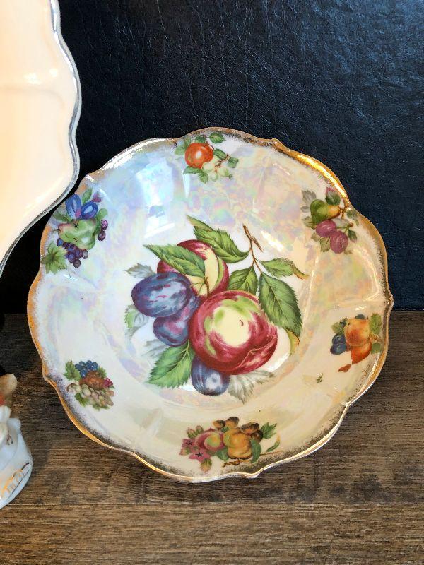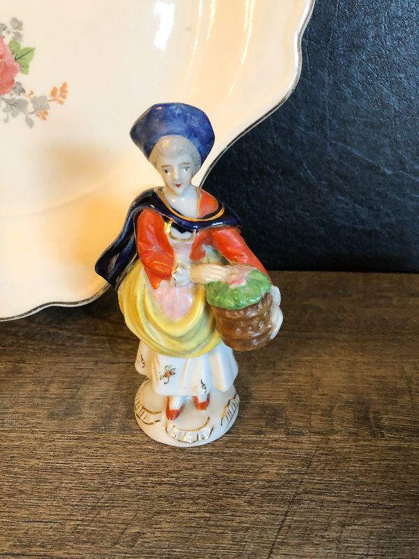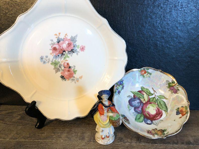 Occupied Japan Figurine and Bowl. Floral Print Platter. Please refer to photos for size and condition. Have fun and happy bidding.