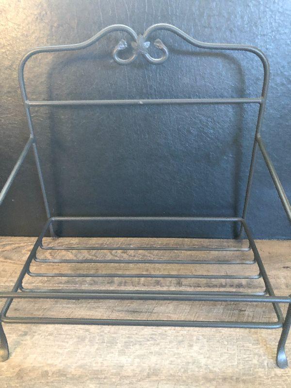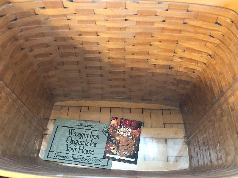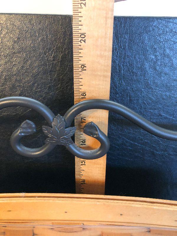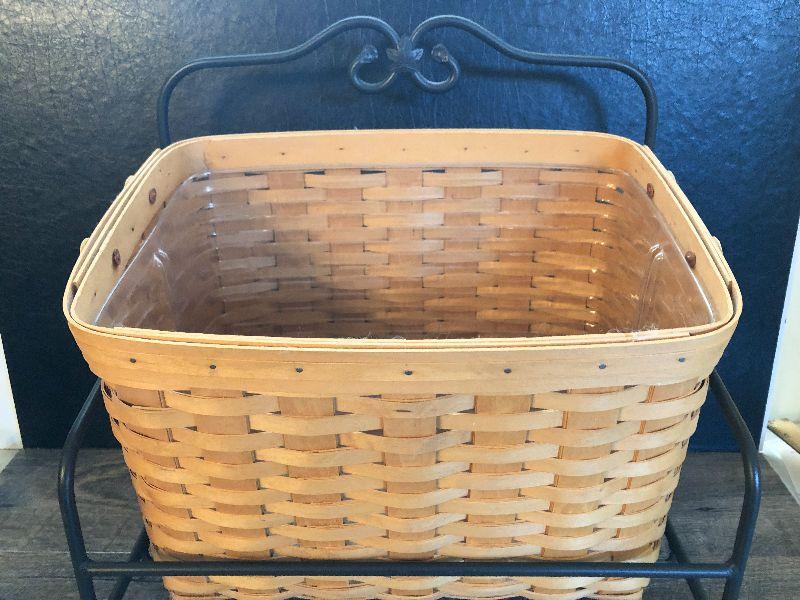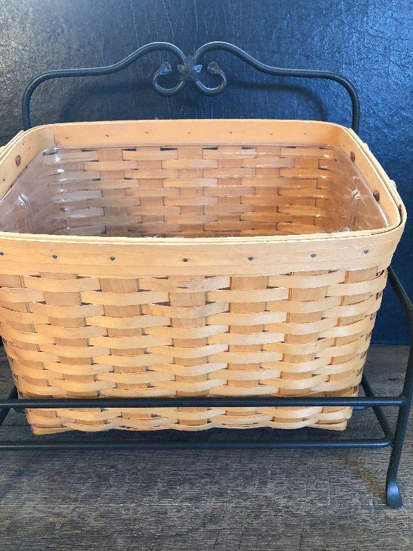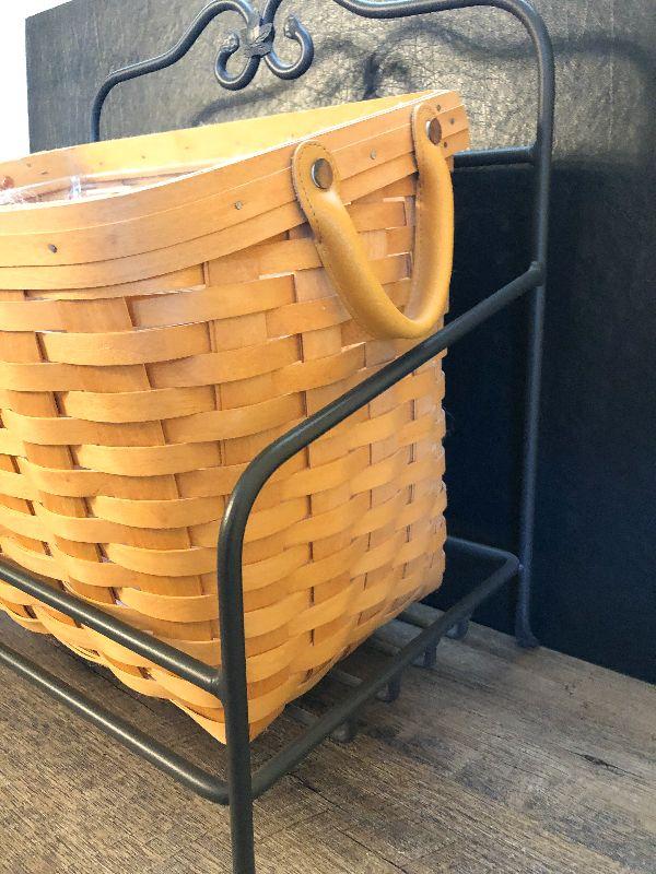 Wrought Iron Stand and Basket by Longaberger. Perfect magazine rack. Please refer to photos for size and condition. Have fun and happy bidding.