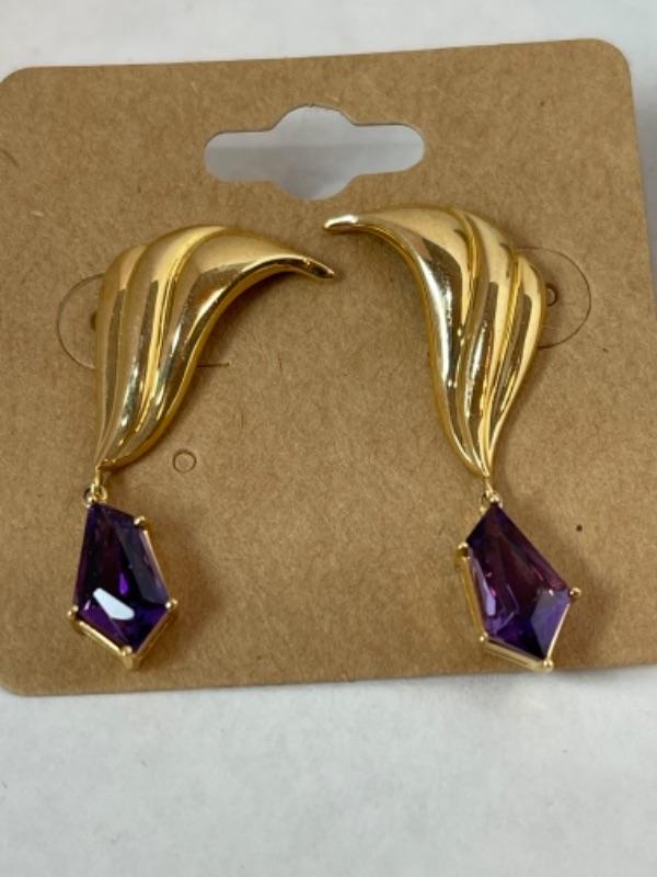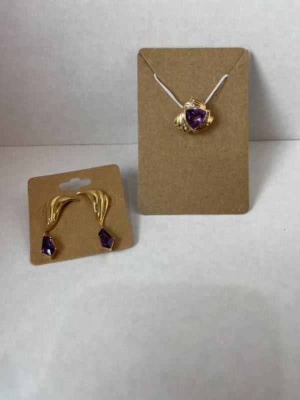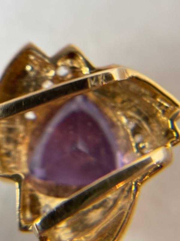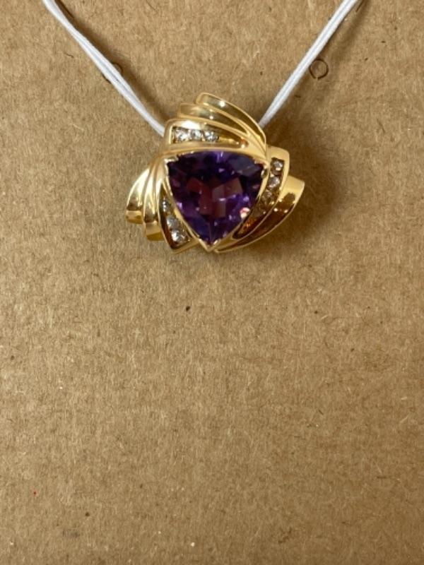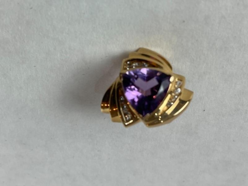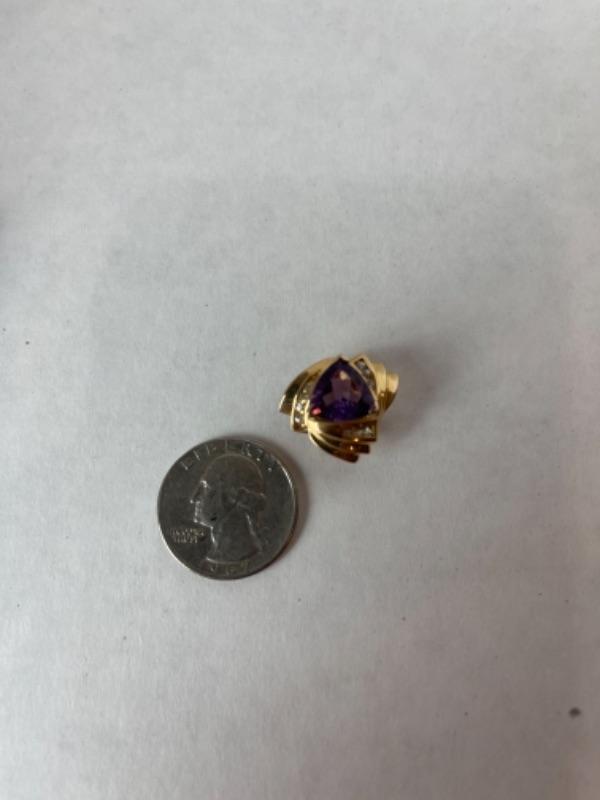 K544 14k Yellow Gold Amythest and Diamond Slide measuring .75” round and 14k yellow gold amethyst Pierced Earrings measuring 1.5” long