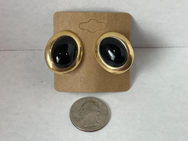 K551 14k Yellow Gold Oval Black Onyx Pierced Clipback Earrings