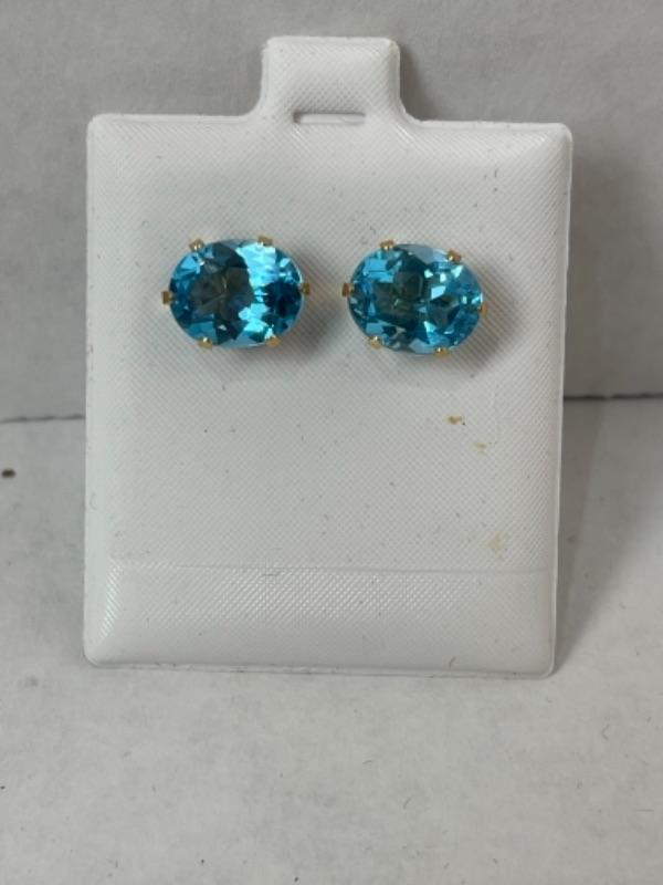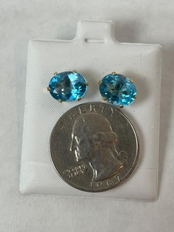 K567 14kt Yellow Gold Oval Blue Topaz Pierced Earrings Stones set in 6 prongs measure approximately 7mm x 10mm in size