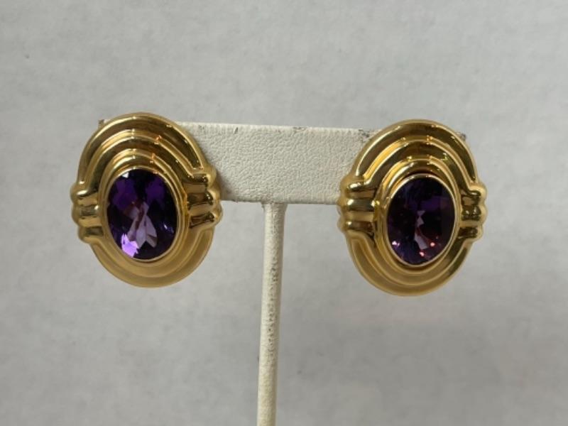 K574 14k Yellow Gold Oval Amethyst Pierced Earrings. Measuring 1.5” tall x 1” wide and weighing 13.8 gms