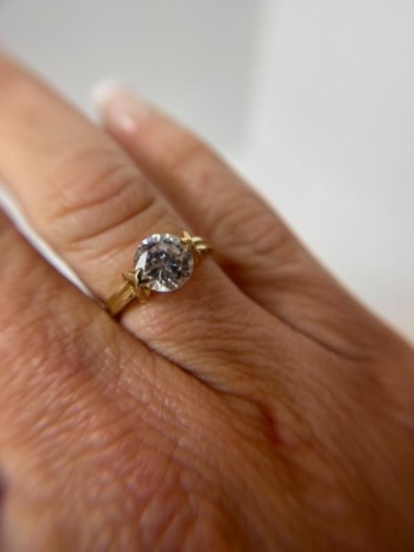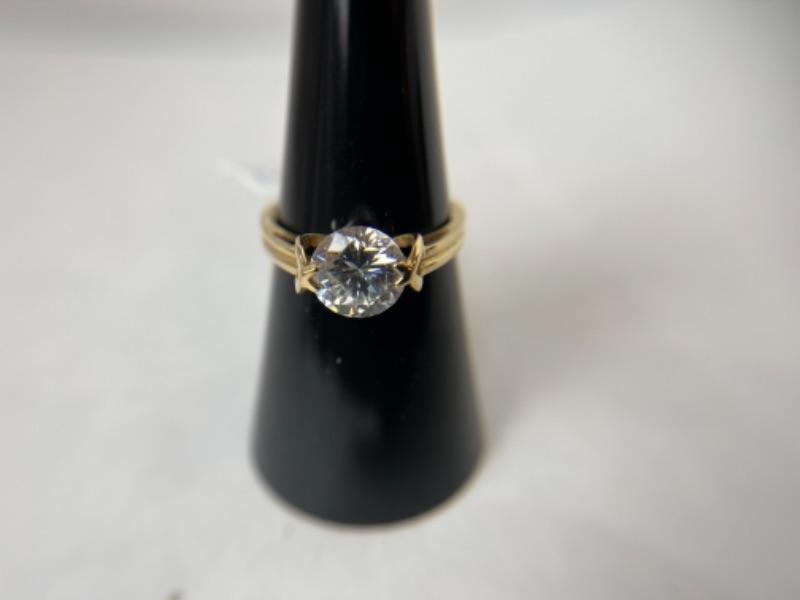 K587 14k Yellow Gold Diamonique CZ Ladies Ring The stone measures 8mm round and is set with two prongs
