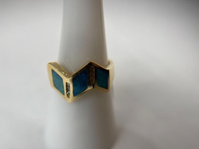 K588 14k Yellow Gold Opal and Diamond Ladies Ring This ring has 6 full cut diamonds approx .01ct ea. = approximately .06ct total weight channel set on easy side of the opal.