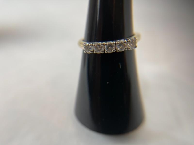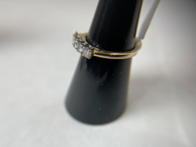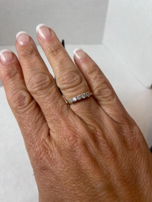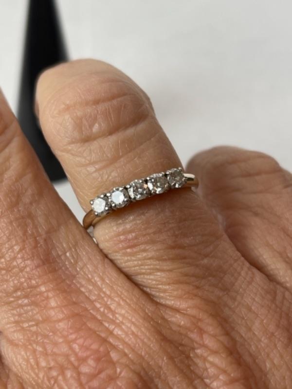 14k yellow gold ladies ring with 5 round brilliant cut Diamond measuring approximately .08ct-.10ct each. = approximately.45-.50ct total weight. Stones are prong set in 14k white gold heads. Ring size is approximately 6.75 weighs 2.6gms.