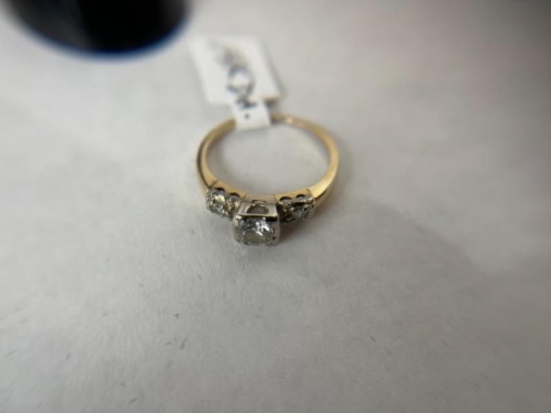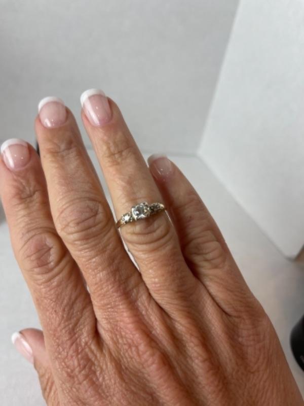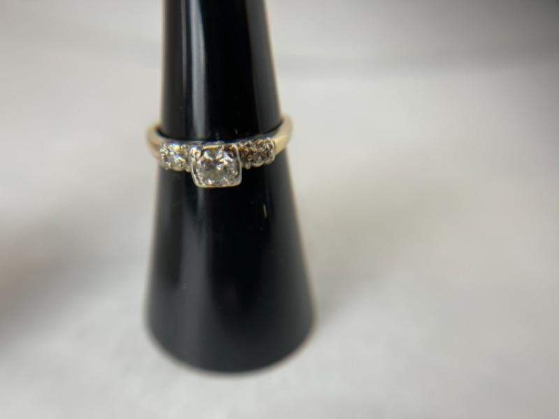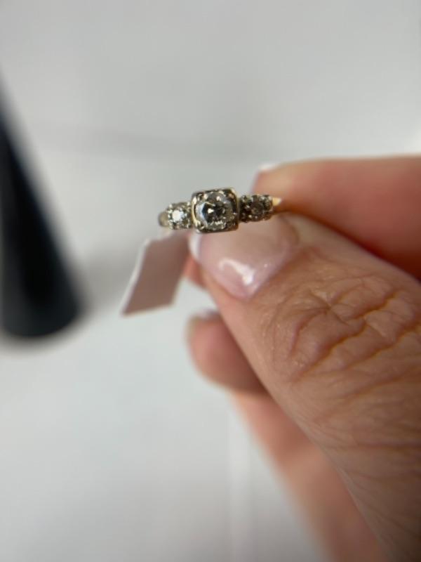 Diamond is a round brilliant cut and measures approximately. .33 ct. with two single cut diamonds at approx. .02 ct each. Ring size is approximately 5.75 and weighs 2.0 grams. Stamped 14k inside shank Ring size is size 6