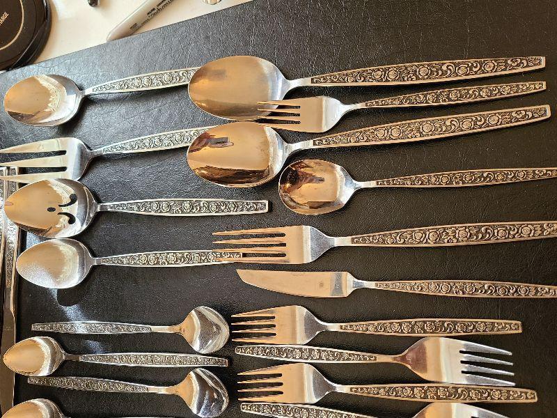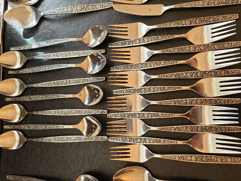 This vintage set is still highly desirable. Please see all pictures for content of lot, there looks to be enough for an 8 person setting with additional pieces. Please see all pictures for exact contents of the lot, condition of the items, and if measurements if taken. Thank you for looking and have fun bidding.