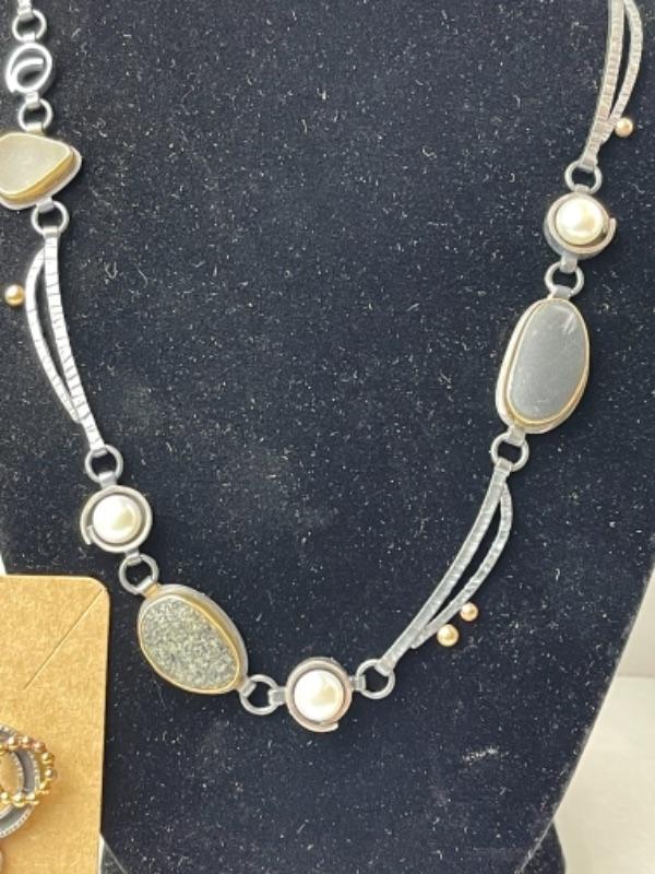K659 Sterling, 14k Yellow Gold, Pearl Necklace and Earrings by Linda Steinworth