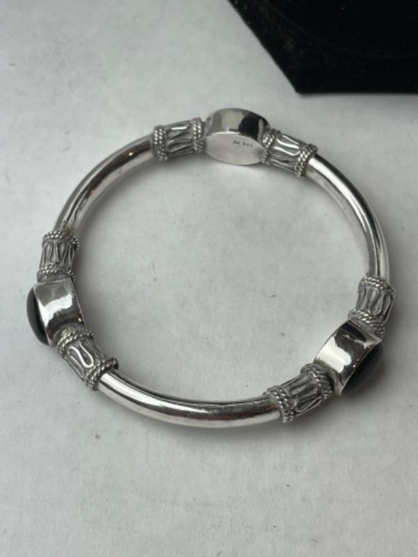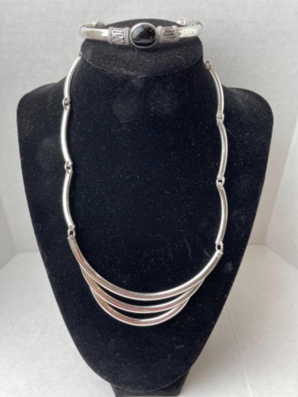 K663 Sterling Silver Link Necklace with Black Onyx Slip-On Bangle Bracelet