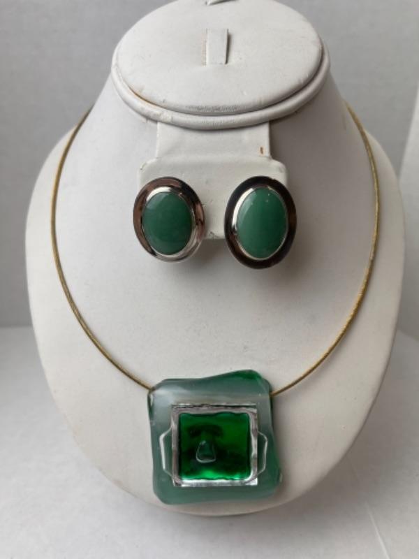 K665 Sterling Chalcedony Oval Earrings and Glass Pendant in cable marked 925