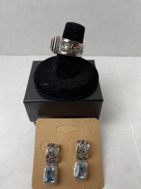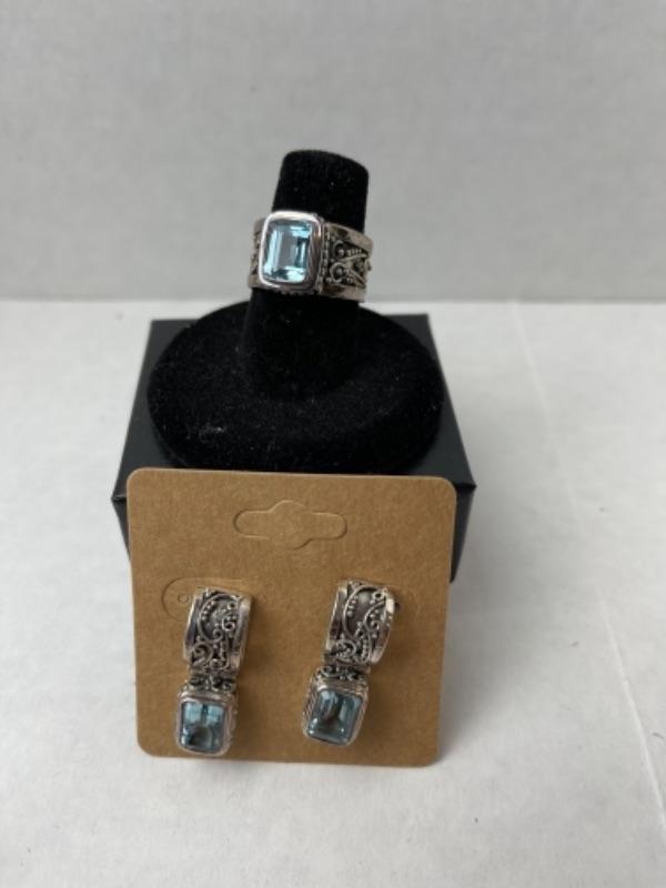 K667 Sterling Silver Blue Topaz Ring And Earring Set