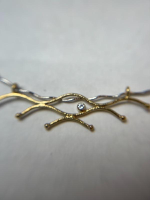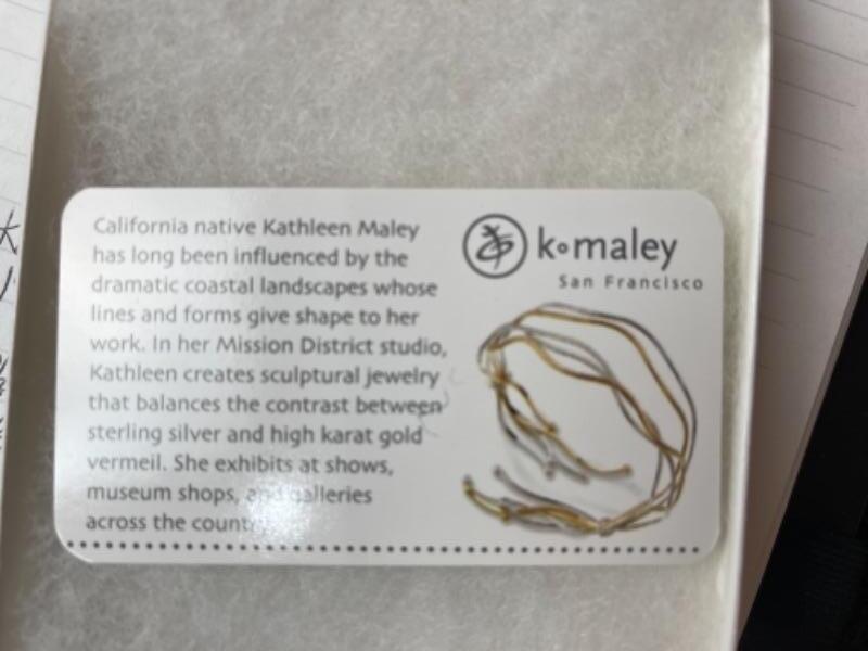 The necklace is by k.Maley of San Francisco and consists of silver 18” necklace with a CZ gold vermeil pendant.