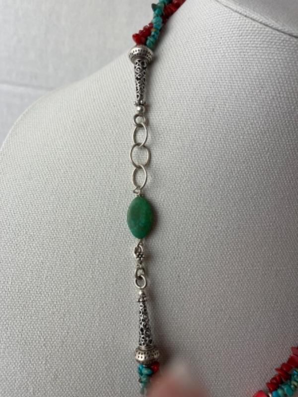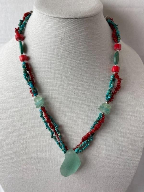 K675 Sterling Sea glass, Coral, Turquoise 24” Necklace