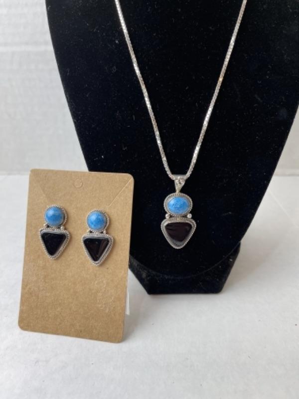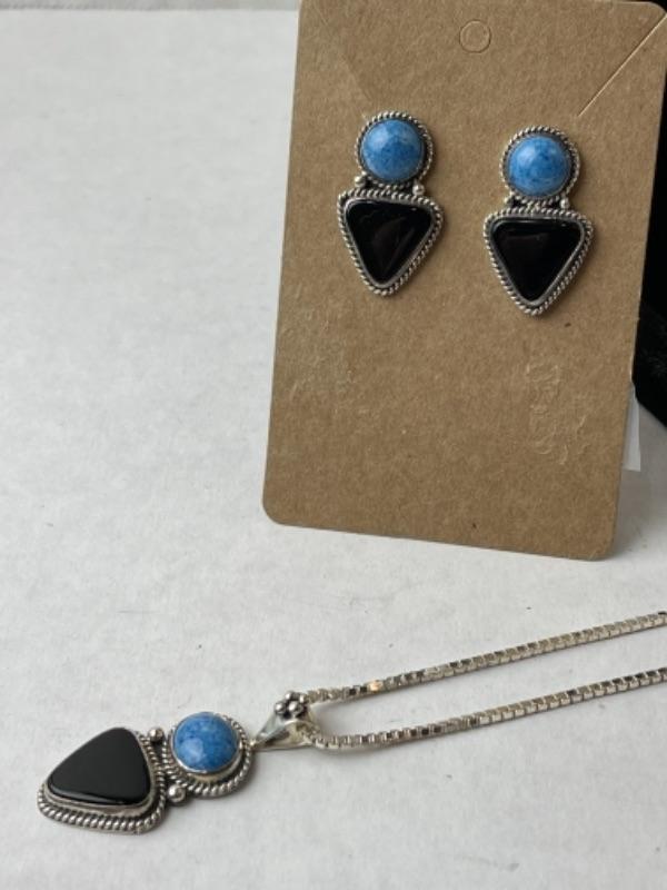 K649 Sterling Silver Black Onyx Denim Lapis Necklace Set