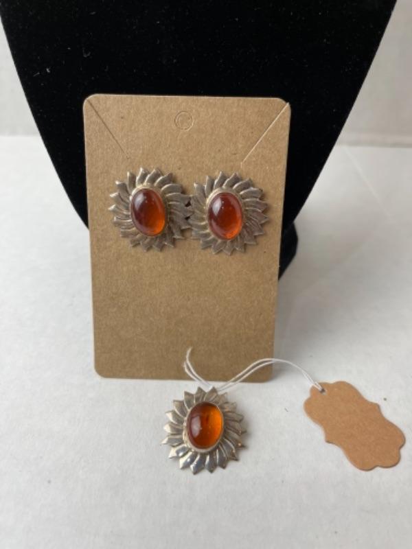 K678 Sterling Silver Amber Sunburst Style Earring and Pendant Set