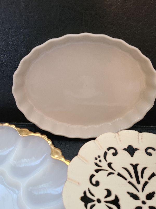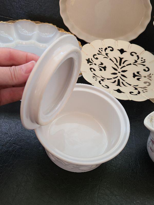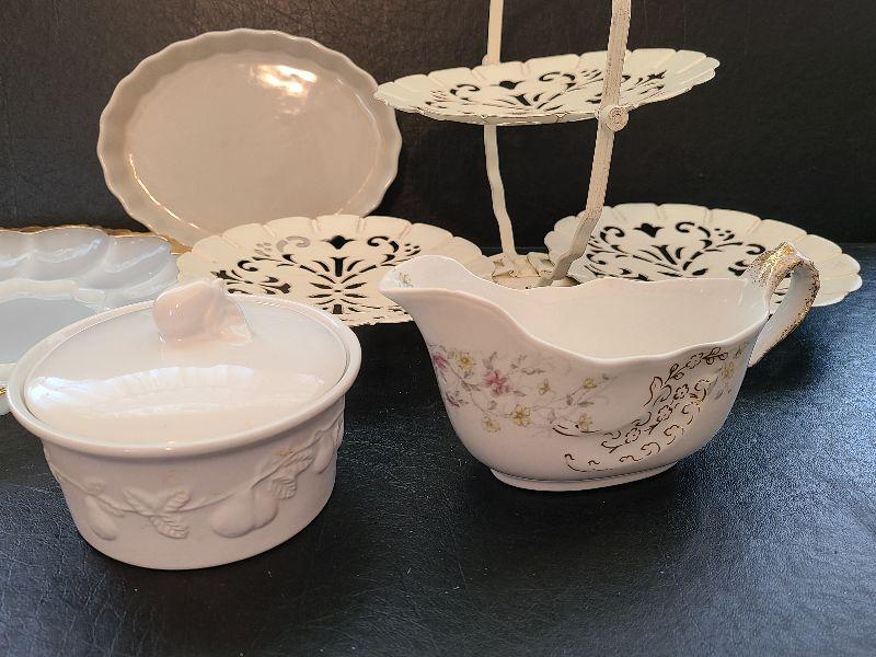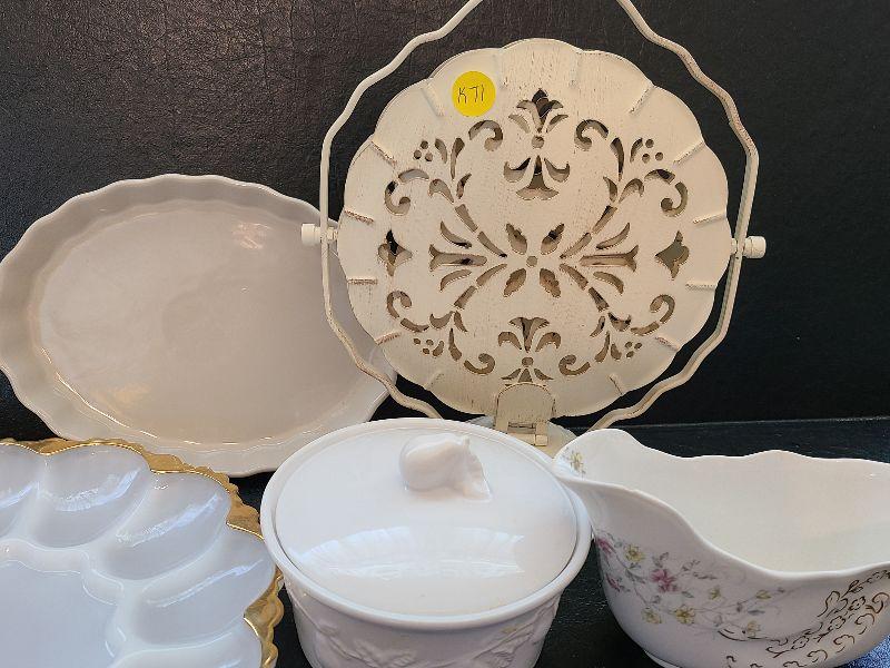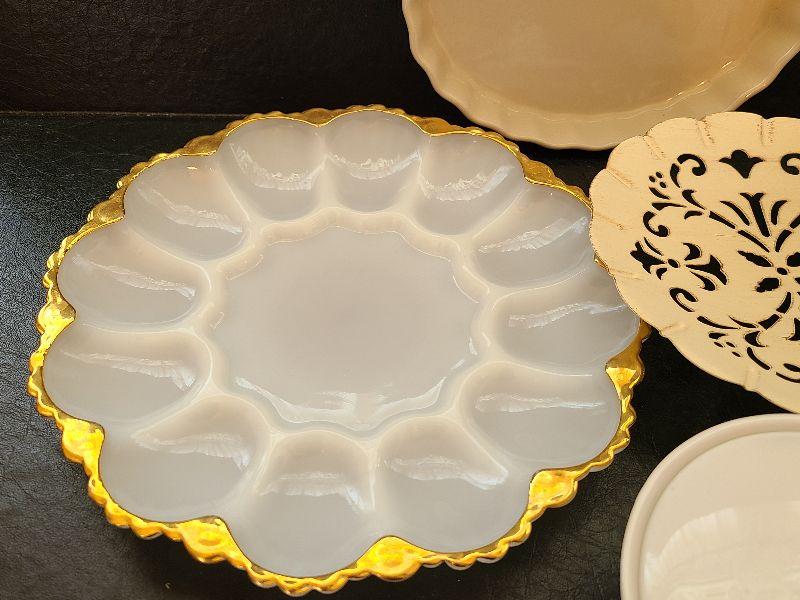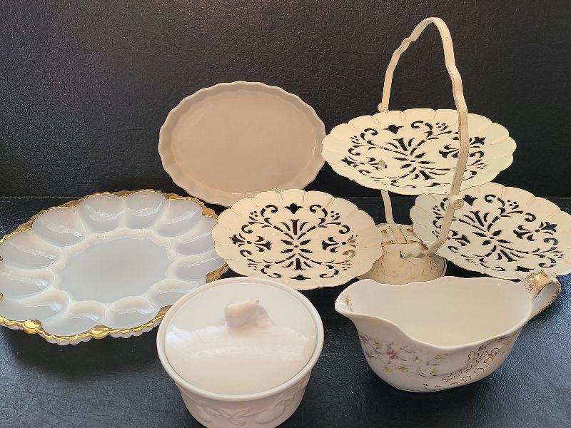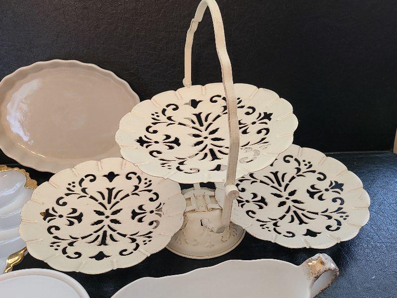 This is a nice lot of serving pieces. A creme brûlée soufflé's dish, metal folding tiered tidbit, milk glass egg plate and more. Please see all pictures for exact contents of the lot, condition of the items, and if measurements if taken. Thank you for looking and have fun bidding.