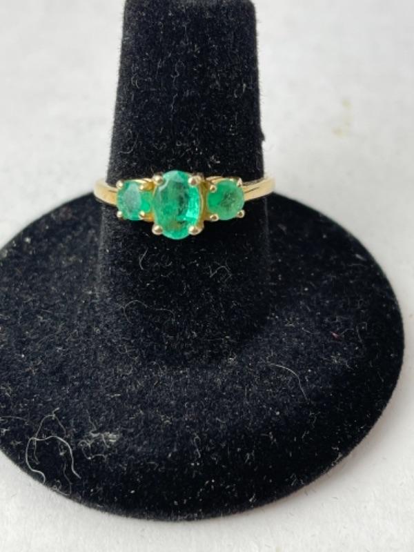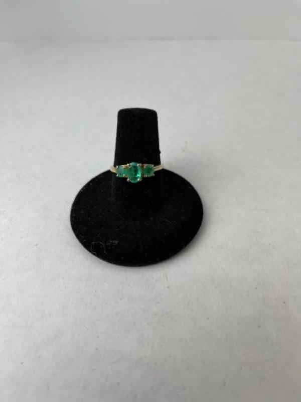 K722 10k Yellow Gold 3 Stone Emerald Ladies Ring weighs 2.4grams and is approximately size 7