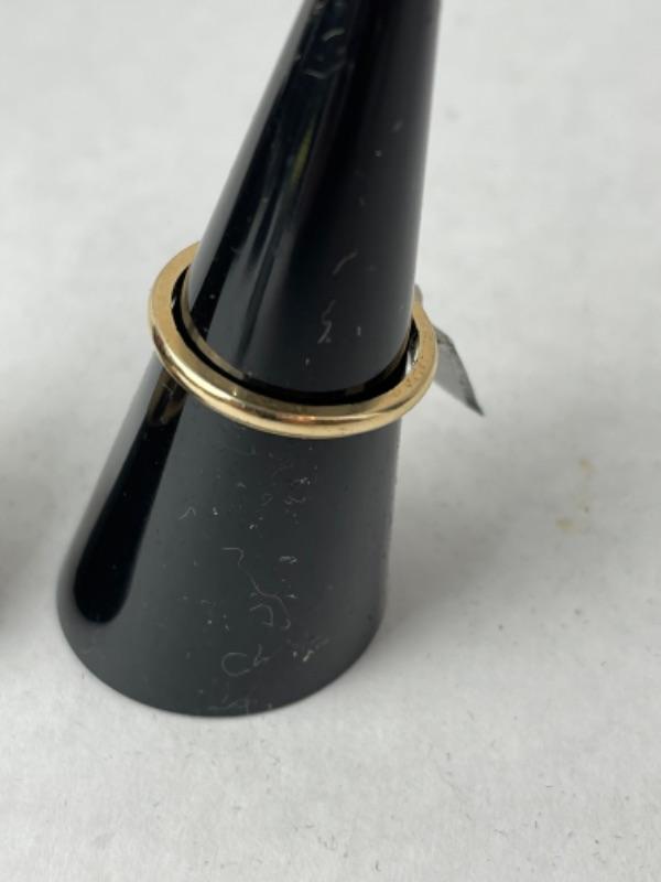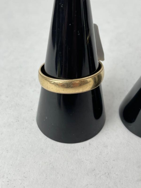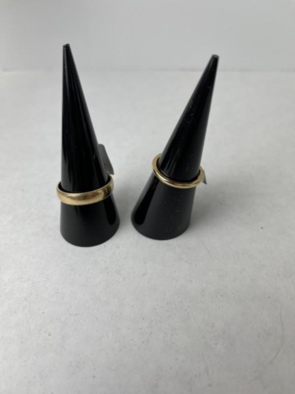 Man measures 5mm wide and marked 10k and weighs 3.6mm and ladies is 2mm and marked 14k and weighs 2.1 grams