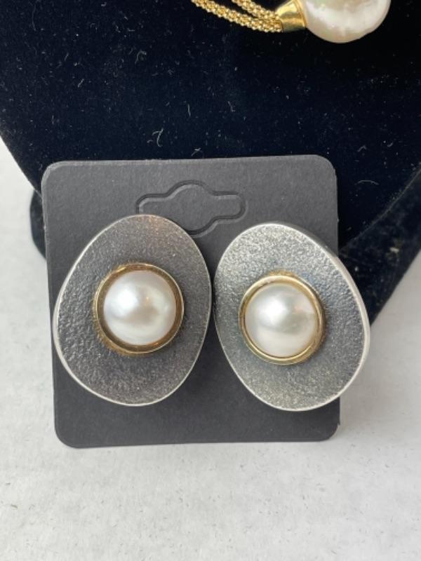 Earrings are genuine Mabe pearl with 14k yellow gold posts and measuring 1.25” x 1” wide